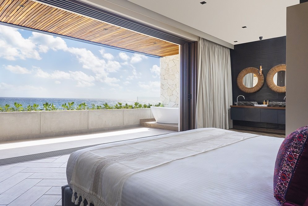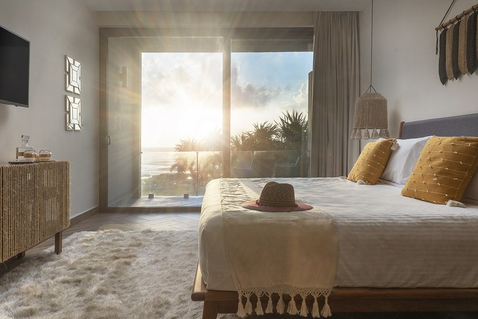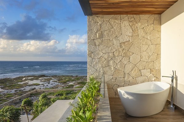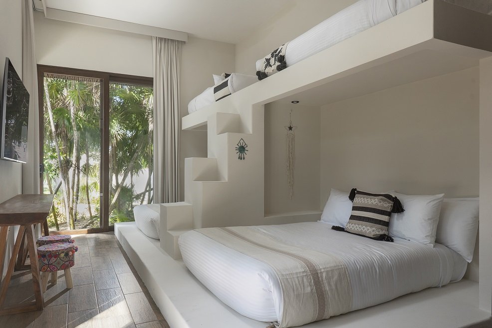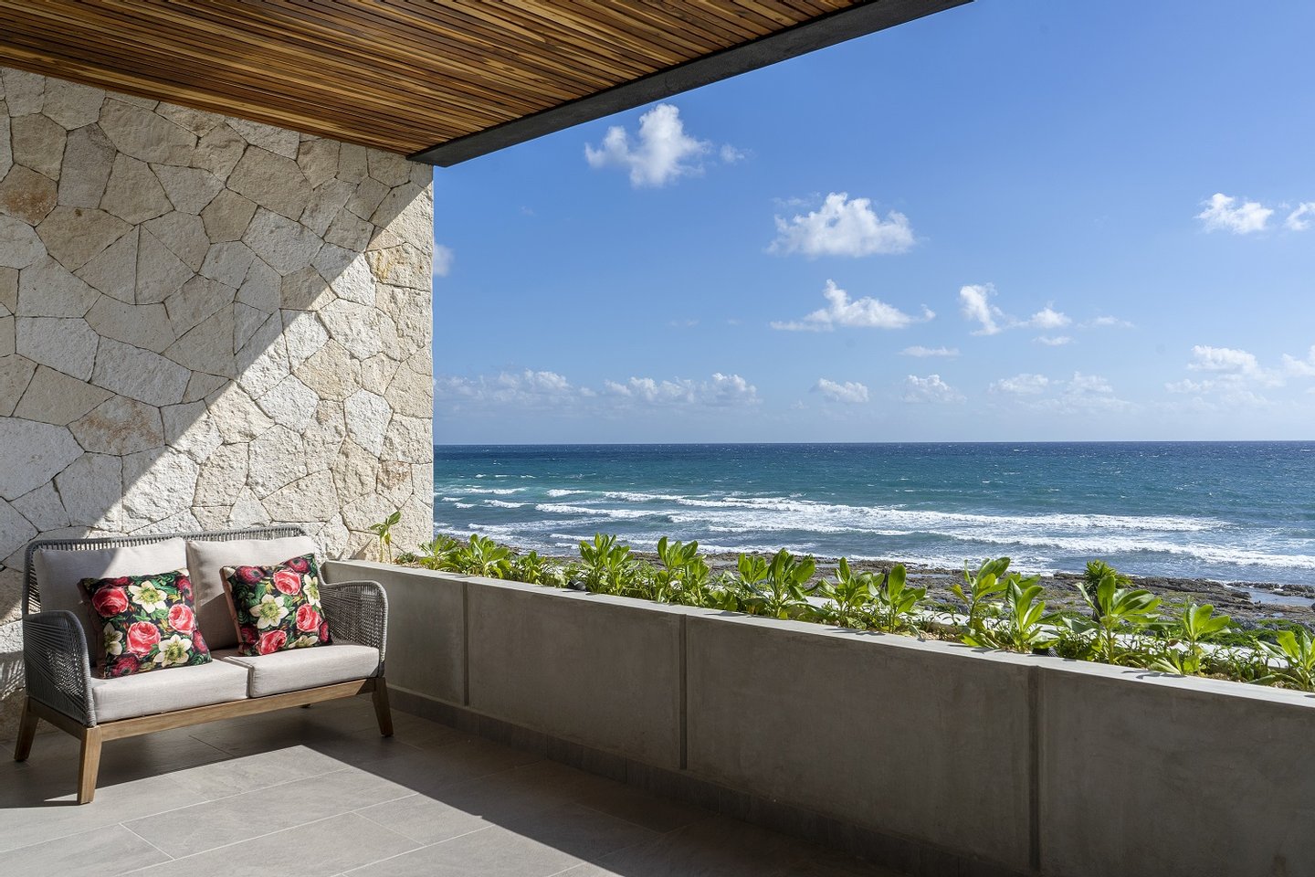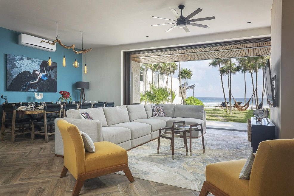 Dieses luxuriöse 3-stöckige Haus mit 4 Schlafzimmern in der Tankah-Bucht in der Nähe von Tulum bietet von der obersten Etage aus einen atemberaubenden Blick auf das Meer und den Maya-Dschungel. Das Erdgeschoss verfügt über ein geräumiges Wohnzimmer,
