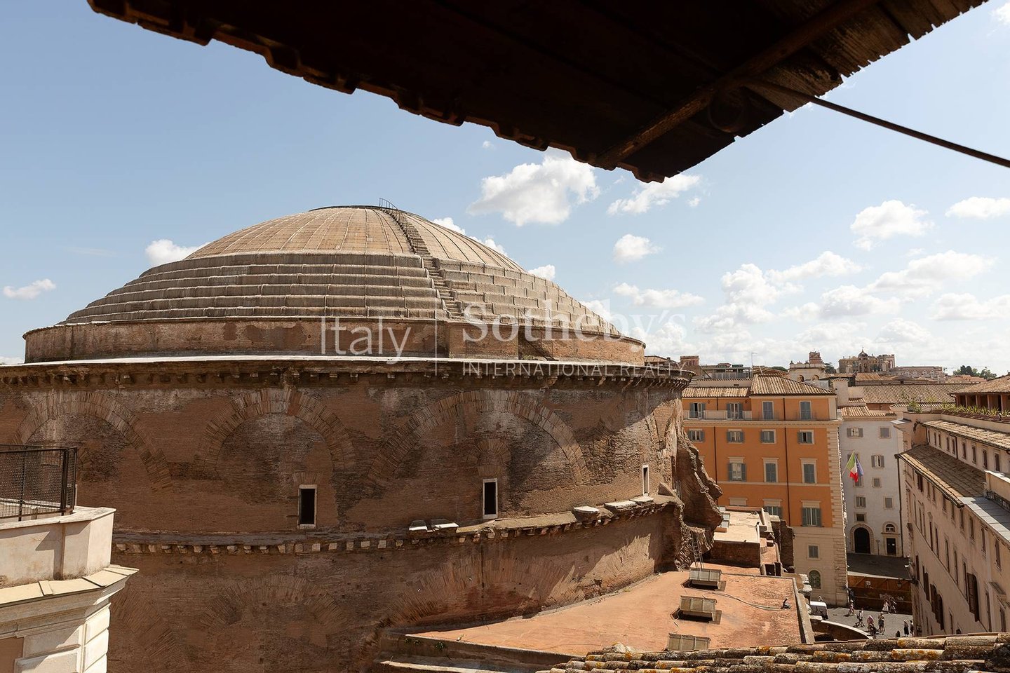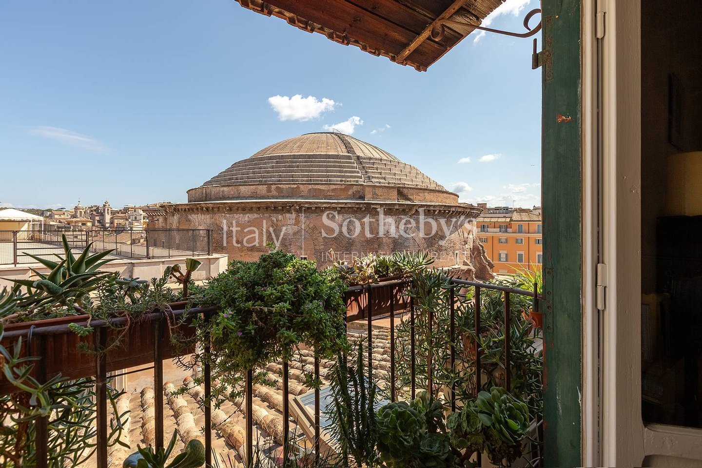 Eine elegante und bequeme Treppe führt zum Hauptloft aus Mauerwerk, das derzeit als Essbereich genutzt wird: Hier öffnet sich ein großes Fenster mit kleinem Balkon direkt zur Kuppel des Pantheon, die fast vollständig sichtbar ist, und bietet einen prächtigen und zeitlosen Ausblick, der den privilegierten Betrachter in die jahrtausendealte Geschichte Roms versetzt. Auf der gegenüberliegenden Seite des Wohnzimmers befindet sich ein zweites, kleineres Loft, konzipiert als Ruhebereich - ein perfektes privates Refugium.