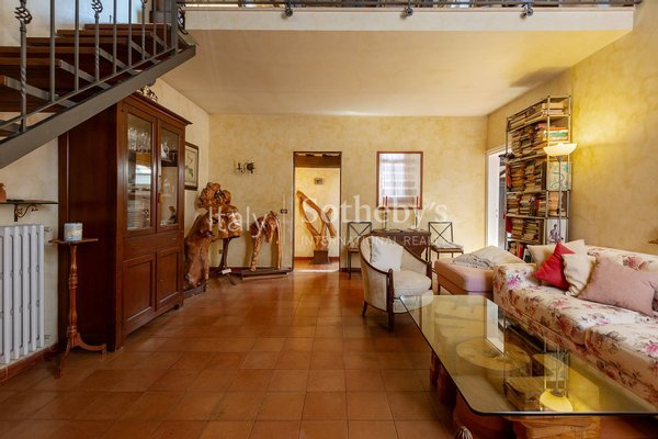 Der Zugang erfolgt derzeit über das Treppenhaus; der Eingangsbereich führt in ein helles Vestibül mit Fenstern auf zwei Seiten, das über wenige Stufen in den einladenden und großzügigen Wohnbereich mündet. Die harmonische und durchdachte Grundrissgestaltung verleiht der Wohnung eine dynamische und zugleich elegante Atmosphäre, verstärkt durch das natürliche Licht, das den ganzen Tag über durch die zahlreichen Öffnungen fällt.