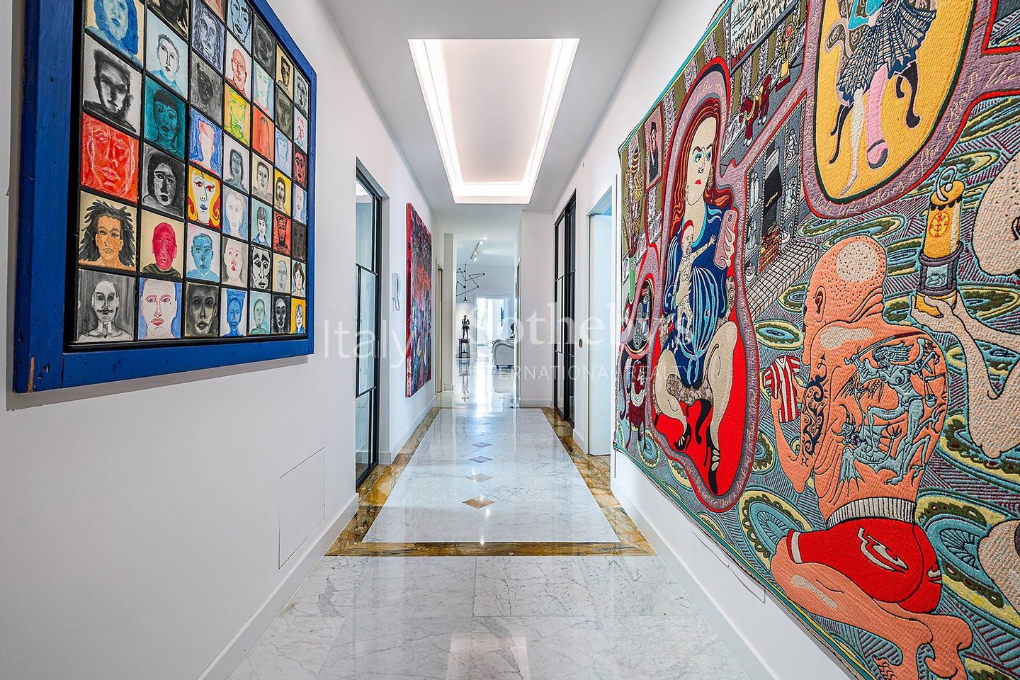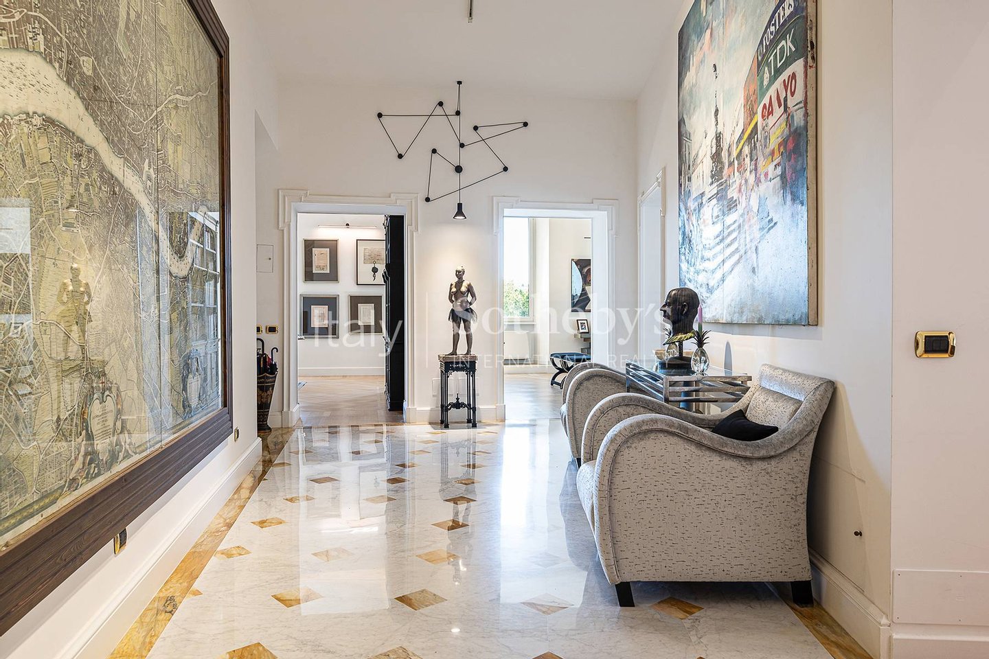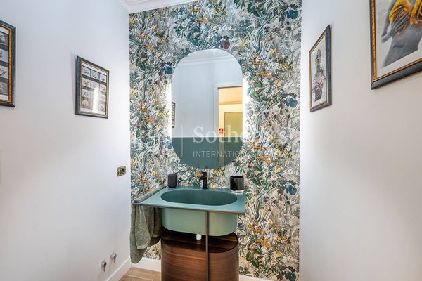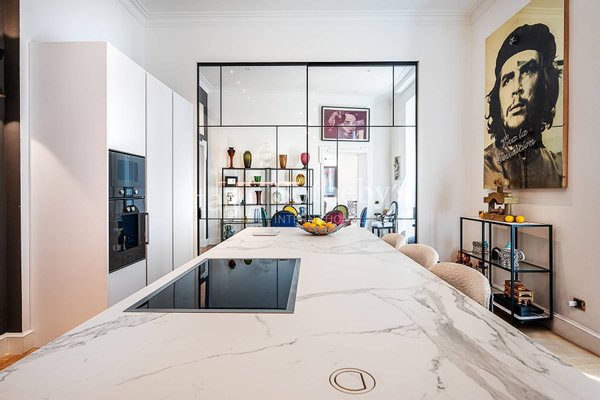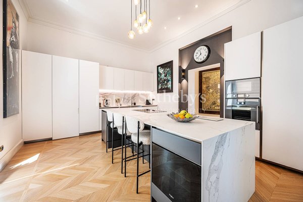 Der Eingang führt zu einer privaten Galerie, die zum dreiteiligen Salon führt, unterteilt in Wohnbereich, Bibliothek und Esszimmer, ein perfektes Gleichgewicht zwischen Repräsentation und Geselligkeit. Die Küche, lichtdurchflutet, ist zeitgemäß und beeindruckend gestaltet, ausgestattet mit einer zentralen Marmorinsel und einem praktischen Frühstücksbereich.