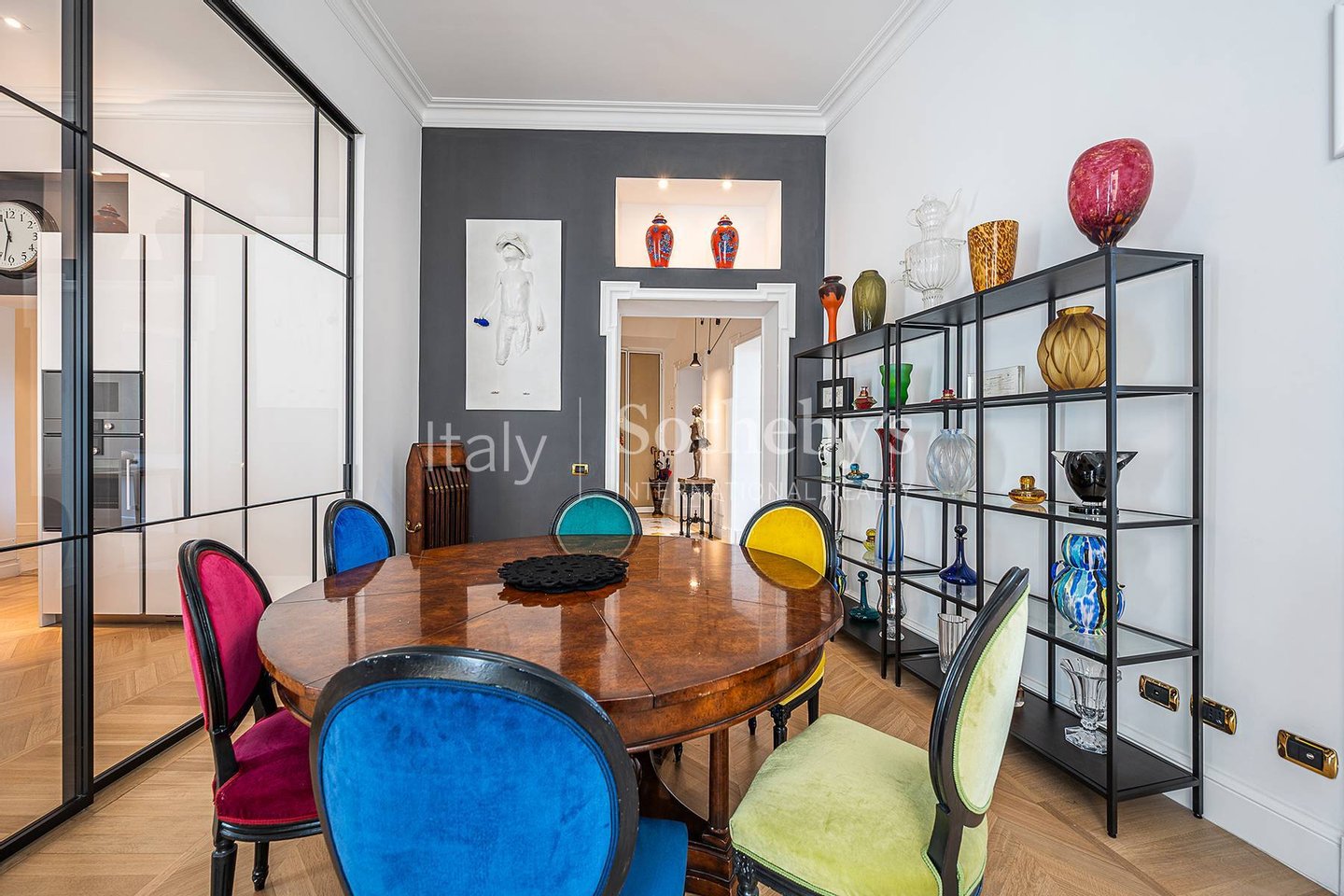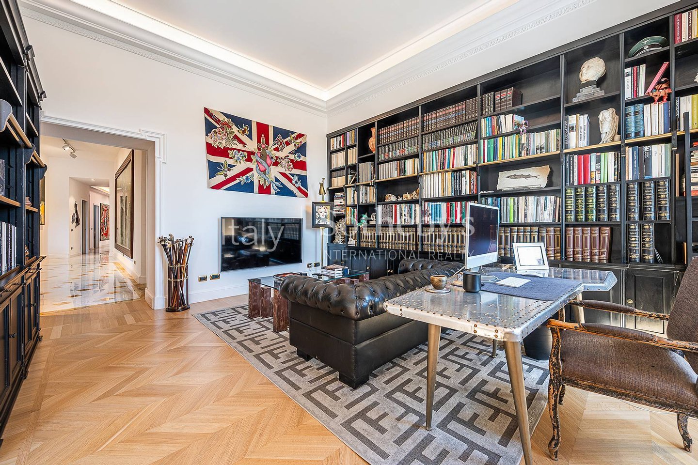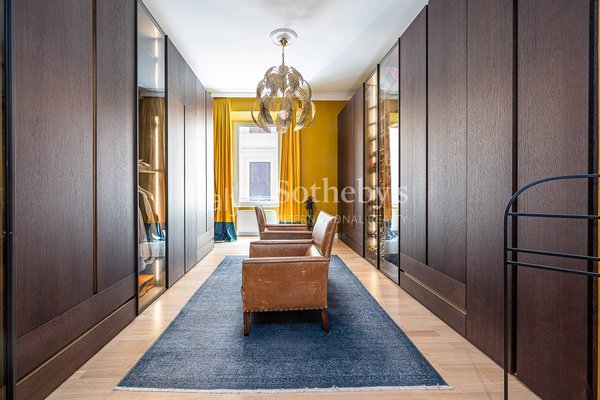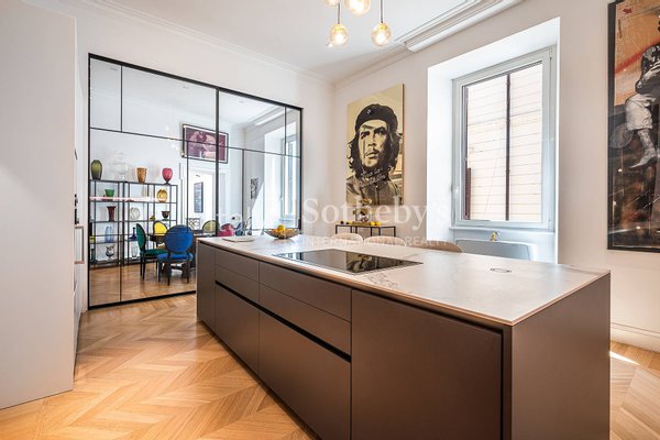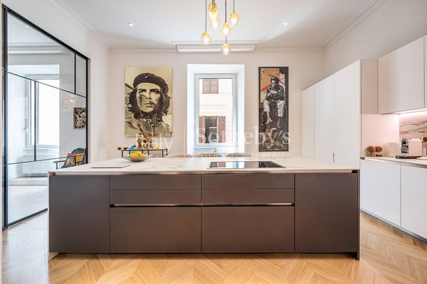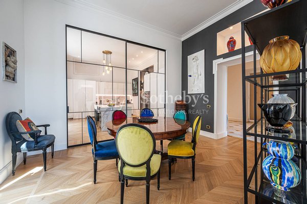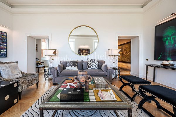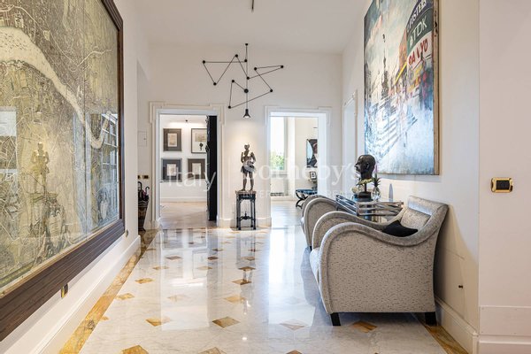 Die Wohnung ist das Ergebnis eines sorgfältig durchdachten Interior-Design-Projekts, bereichert durch maßgefertigte Möbel und Kunstwerke, und bietet großzügige, luftige Räume, veredelt durch hohe Decken, edle Holzböden und hochwertige Materialien.