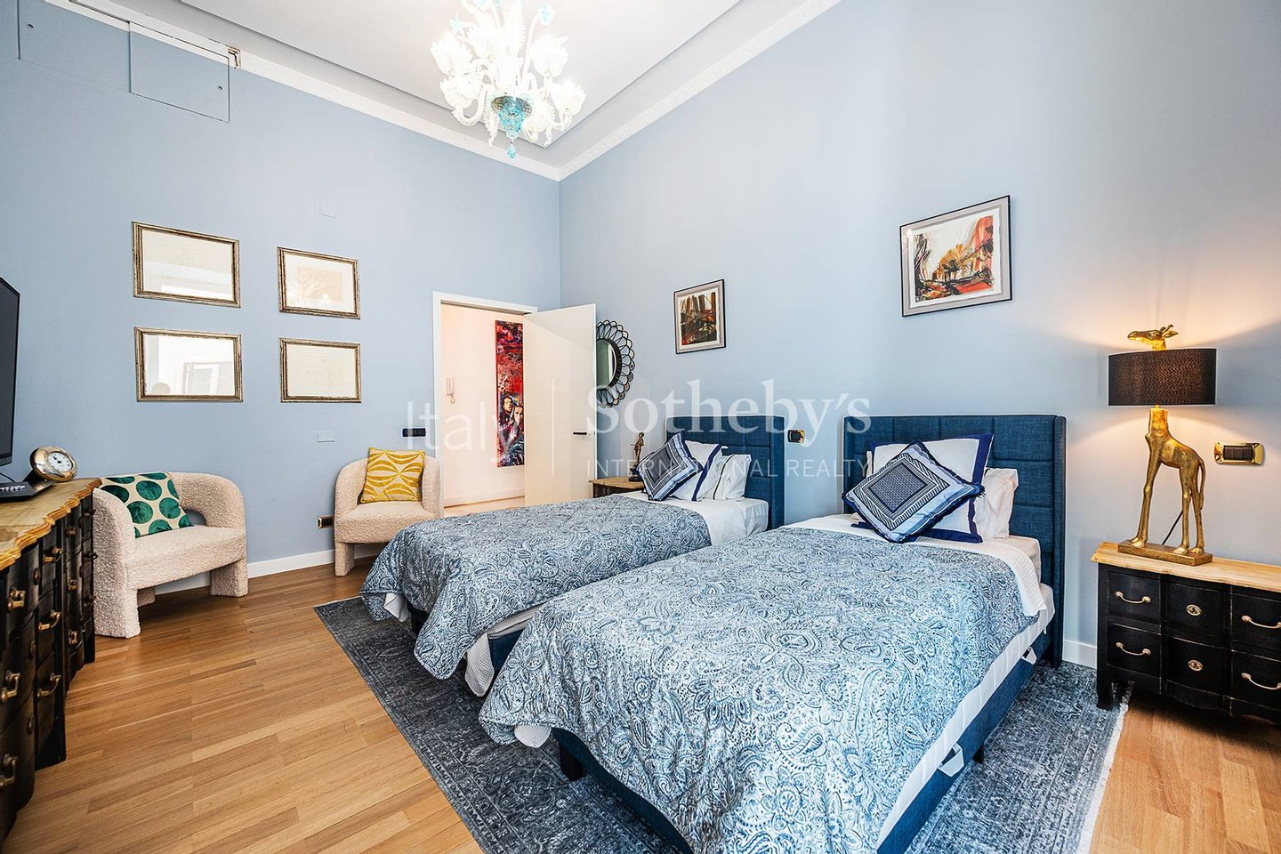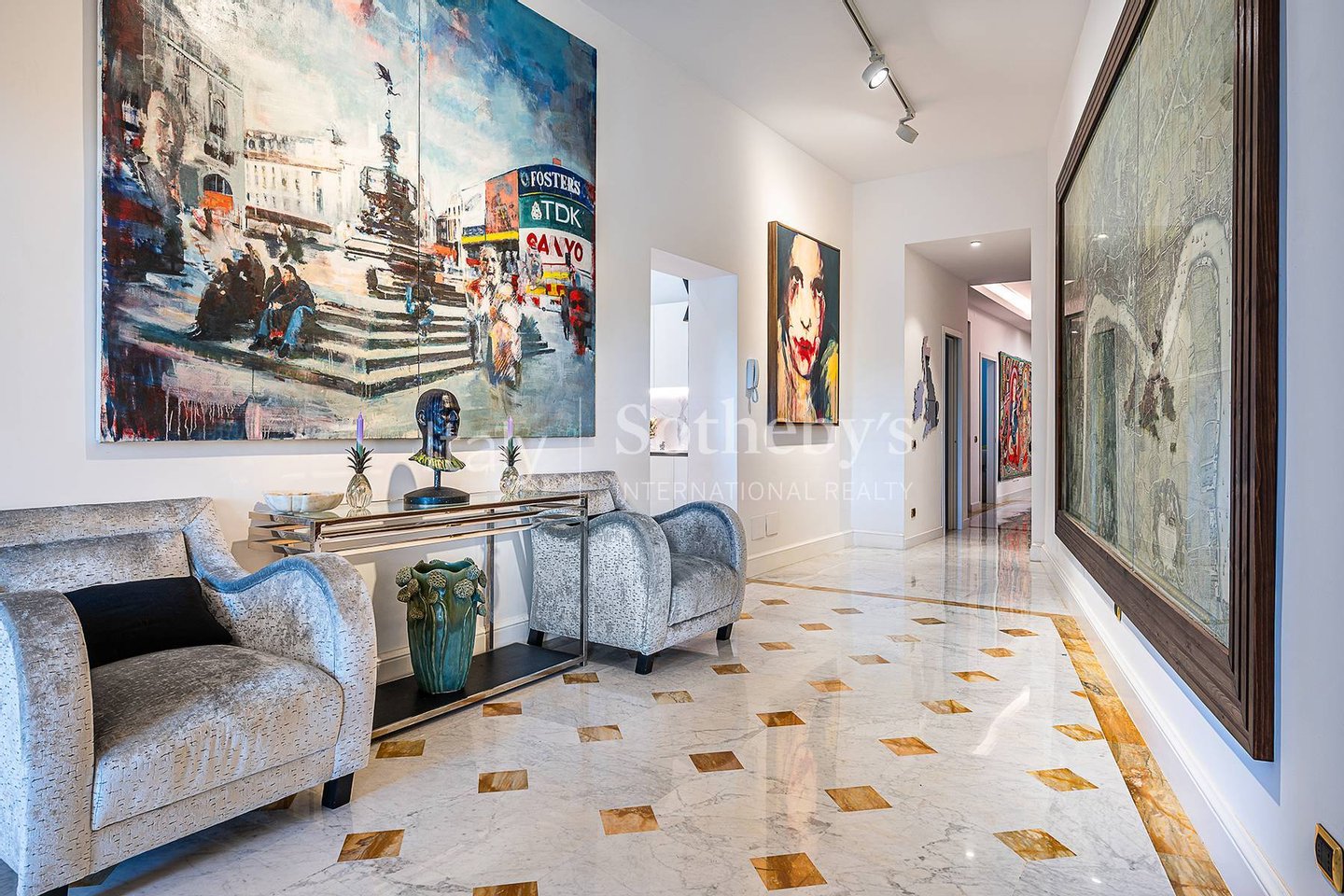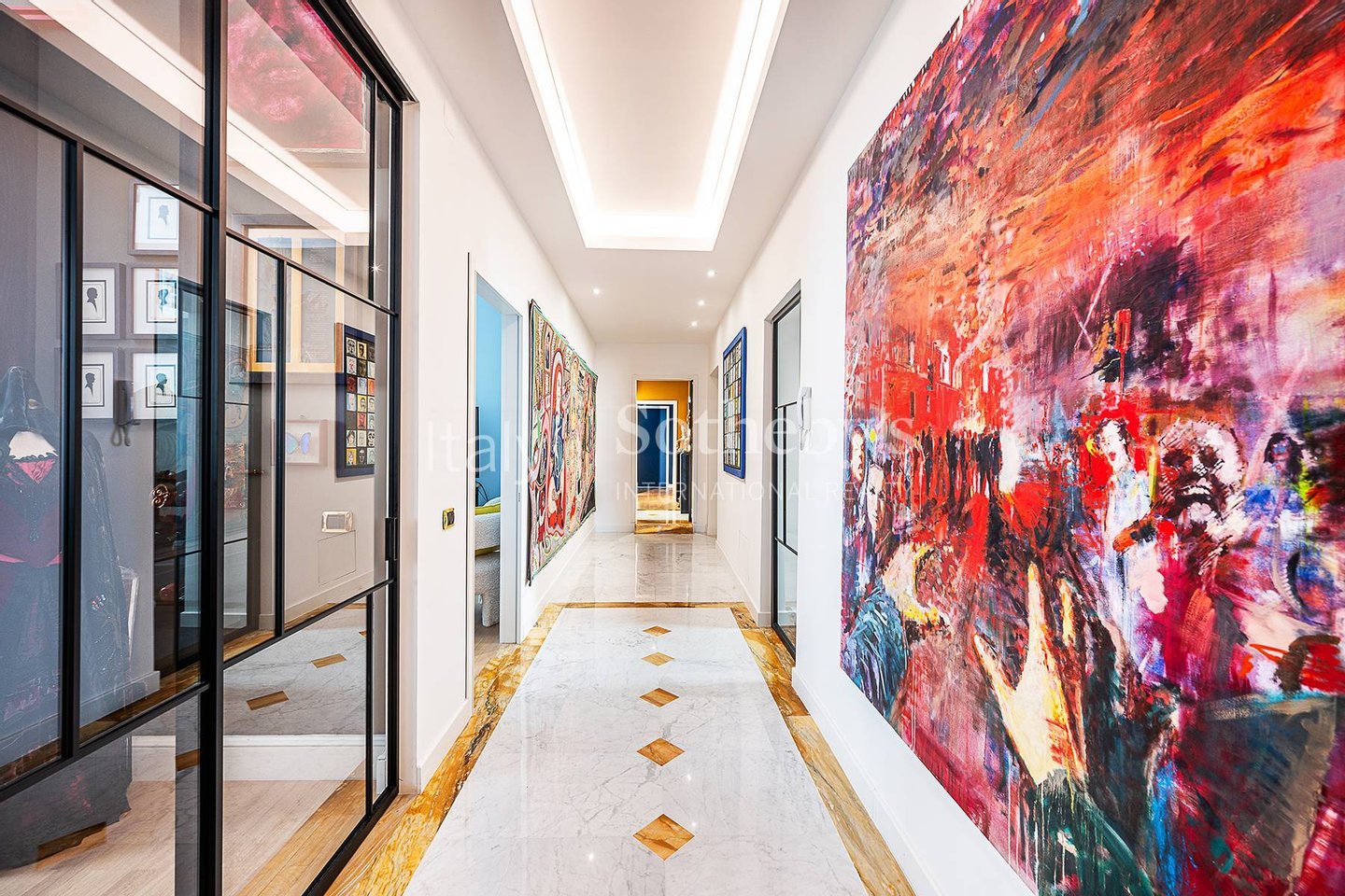 Die Wohnung ist das Ergebnis eines sorgfältig durchdachten Interior-Design-Projekts, bereichert durch maßgefertigte Möbel und Kunstwerke, und bietet großzügige, luftige Räume, veredelt durch hohe Decken, edle Holzböden und hochwertige Materialien.