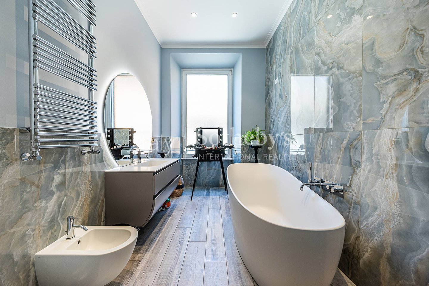 Der Schlafbereich umfasst drei elegante Schlafzimmer, darunter eine raffinierte Master Suite mit einem geräumigen, eleganten Ankleidezimmer mit maßgefertigten Glas-Schrankfronten. Die vier Badezimmer sind funktional in Bezug auf die Räume verteilt und zeichnen sich durch hochwertige Ausstattungen wie freistehende Badewannen, begehbare Duschen, Marmor- und Onyxoberflächen aus.