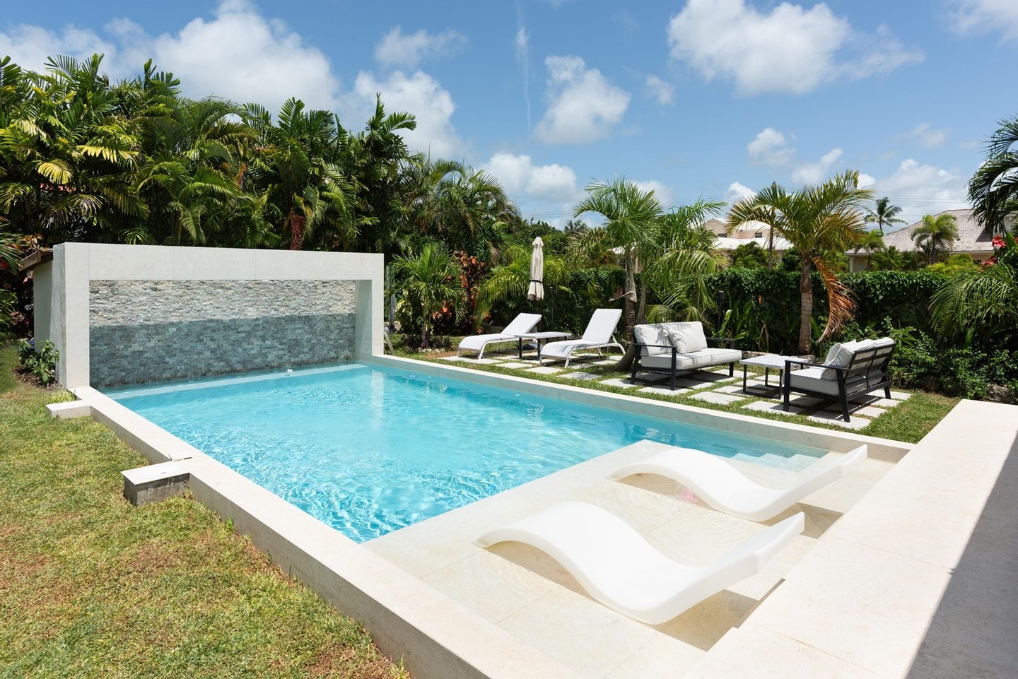 - Living im Freien – Weitläufige Terrasse mit angelegten Gärten, 30 Fuß x 15 Fuß großer Salzwasserpool mit Solarium und weinender Wand sowie schwimmende Liegen für entspannte Nachmittage.