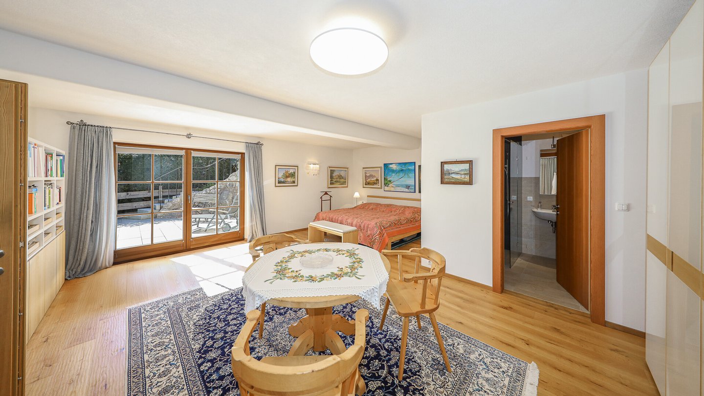 Im Erdgeschoss befindet sich die überaus großzügige Küche mit Esstisch für 10 Personen mit Zugang auf eine der Terrassen sowie ein Gästezimmer mit Bad.