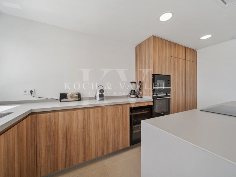 * Espace jour : Une kitchenette design lumineuse, entièrement équipée d'appareils Siemens haut de gamme, notamment un refroidisseur à vin, une machine à laver et un sèche-linge. Le spacieux salon-salle à manger s'ouvre par de grandes fenêtres sur la terrasse principale, l'espace barbecue et la piscine à débordement, qui se fond avec le bleu de la mer. La terrasse dispose d'un porte-à-faux de 16,60 m² et d'un porche couvert confortable.
