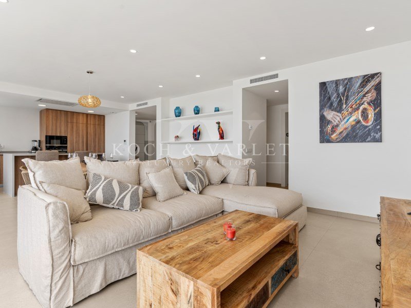 * Espace jour : Une kitchenette design lumineuse, entièrement équipée d'appareils Siemens haut de gamme, notamment un refroidisseur à vin, une machine à laver et un sèche-linge. Le spacieux salon-salle à manger s'ouvre par de grandes fenêtres sur la terrasse principale, l'espace barbecue et la piscine à débordement, qui se fond avec le bleu de la mer. La terrasse dispose d'un porte-à-faux de 16,60 m² et d'un porche couvert confortable.