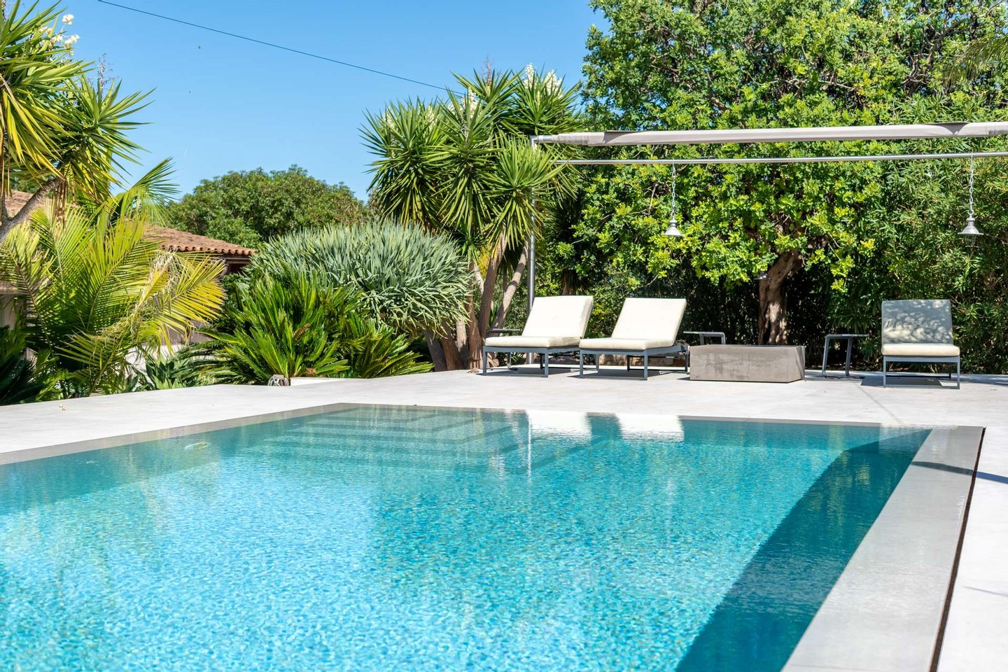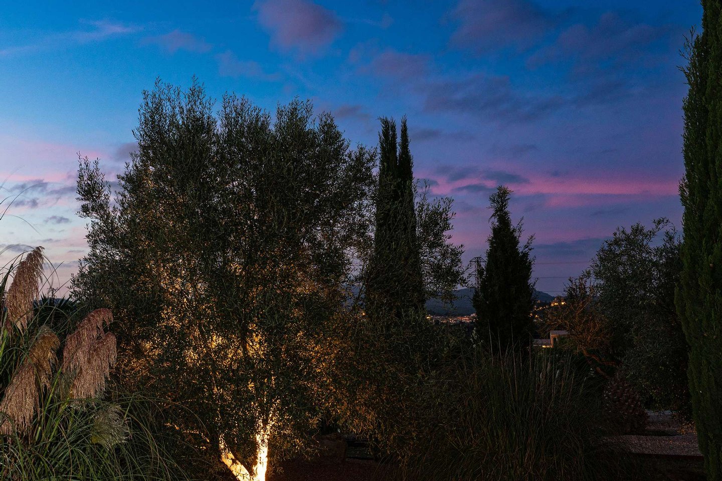 Das komplett eingefriedete Grundstück mit elektrischem Tor bietet maximale Privatsphäre. Eine automatische Bewässerung versorgt den stimmungsvoll beleuchteten Garten mit Avocado-, Maracuja-, Feigen-, Mandel-, Orangen- und Zitronenbäumen. Großzügige Terrassen, ein Salzwasser-Infinitypool mit Sonnensegeln über Pool und Poolterrasse schaffen ideale Rückzugsorte. Ergänzt wird das Angebot durch ein Gästeapartment und eine geräumige Garage.