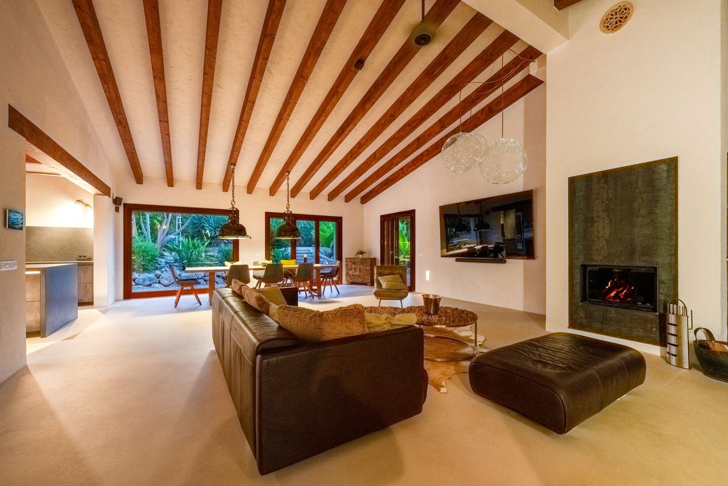 Eingebettet in die mediterrane Hügellandschaft überzeugt diese Finca durch Ruhe, Weitblick und ein stimmiges Wohnkonzept. Hochwertige Materialien, klare Linien und warme Naturtöne greifen die mallorquinische Bauweise auf – Mikrozementböden und Fußbodenheizung in allen Räumen sorgen für zeitlosen Komfort.