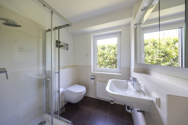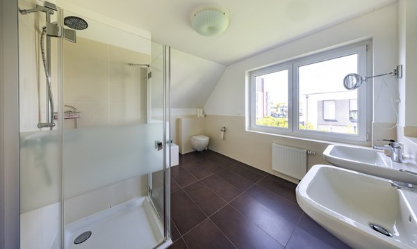 Im Erdgeschoss befinden sich darüber hinaus ein vielseitig nutzbares Arbeits- oder Gästezimmer sowie ein heller Hauswirtschaftsraum. Dieser bietet nicht nur Platz für Waschmaschine und Trockner, sondern beherbergt auch die innovative Heizungsanlage des Hauses: eine effiziente Abluftwärmepumpe. Die Kombination aus Abluftwärme und flächendeckender Fußbodenheizung sorgt für ein behagliches Raumklima – nachhaltig, zukunftssicher und ressourcenschonend. Das Gebäude wurde nach dem KfW-55-Effizienzhaus-Standard errichtet und erfüllt damit höchste energetische Anforderungen. Komplettiert wird diese Geschossebene durch ein geschmackvoll gestaltetes Duschbad mit WC. Dieses überzeugt durch dunkelbraune Bodenfliesen, cremefarbene Wandfliesen im Format 30 x 60 cm sowie ein Fenster, das für natürliche Belichtung und Belüftung sorgt – ideal für Gäste oder für den Alltag.