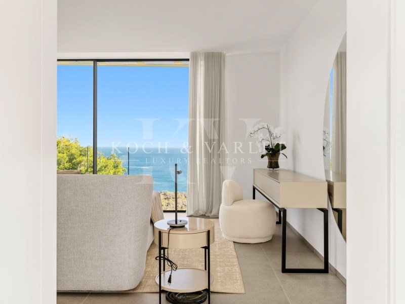 L'intérieur reflète un style contemporain et cosy. Un salon avec des fenêtres panoramiques inonde les espaces de lumière naturelle et communique directement avec la mer. La cuisine ouverte avec îlot en marbre, équipée d'appareils Siemens, est combinée à une salle à manger lumineuse, conçue pour profiter de réunions mémorables. Les salles de bains avec éclairage encastré et matériaux nobles ajoutent une touche d'élégance et de sophistication. La villa dispose également d'un garage pour 3 voitures.