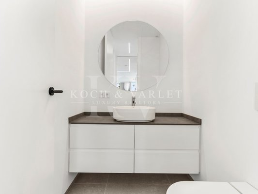 Sur un grand terrain de 1 605 m², la villa déploie 420 m² construits répartis sur deux étages et un sous-sol, reliés par un ascenseur moderne et un escalier intérieur design. Il dispose de 4 chambres à coucher et 5 salles de bains, dont la suite principale avec un walk-in et une salle de bain complète avec baignoire et douche. Plus de 125 m² de terrasses panoramiques entourent la propriété, intégrant l'intérieur à l'extérieur.