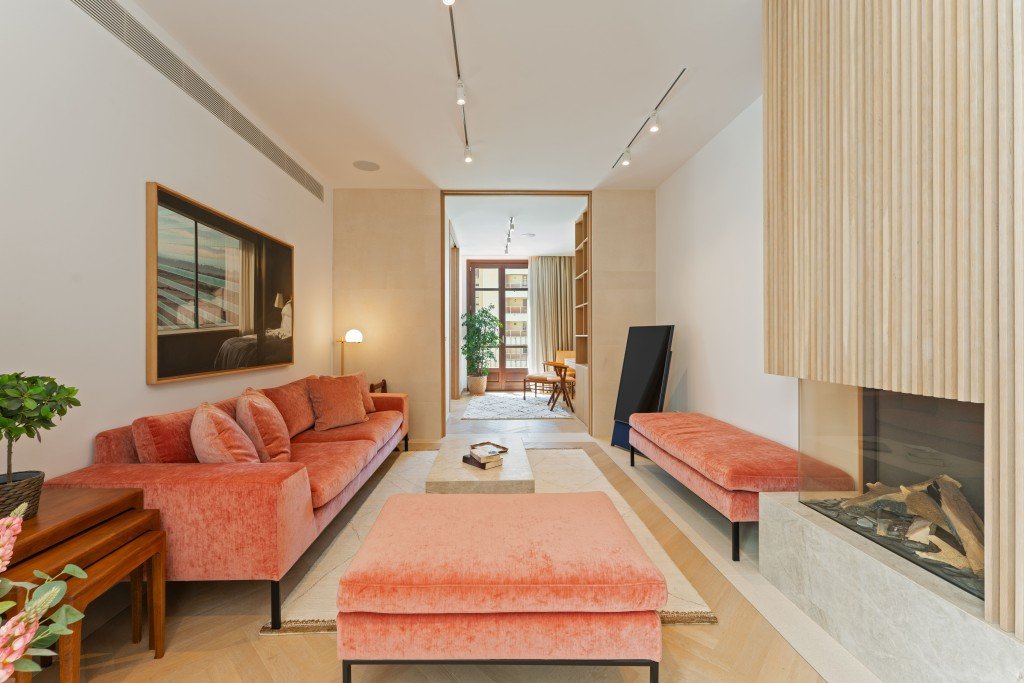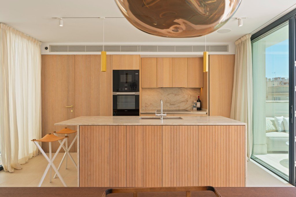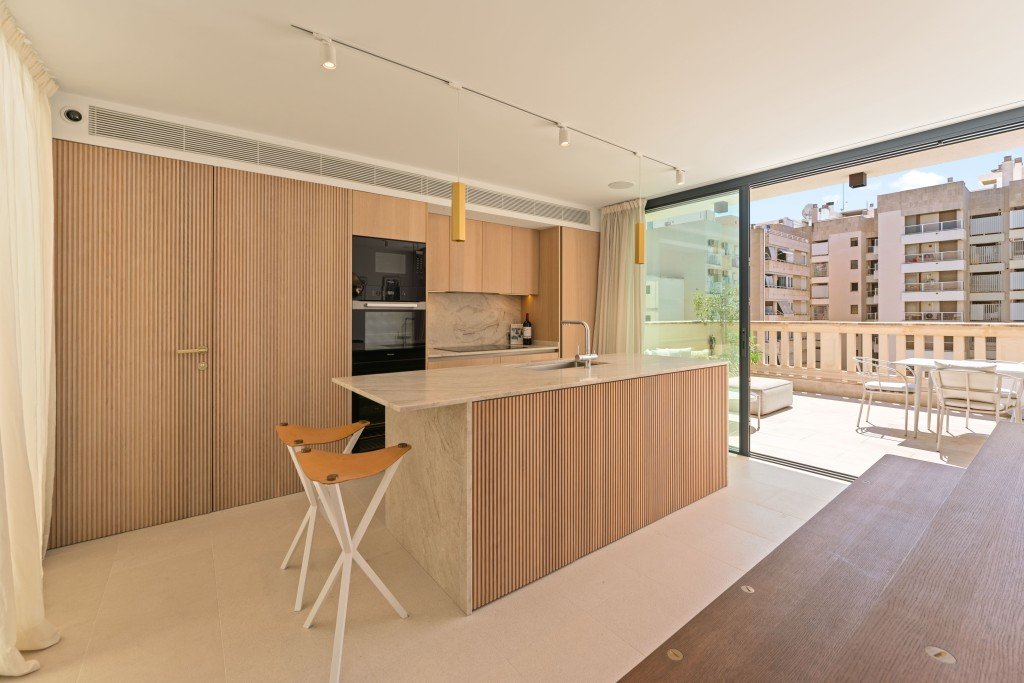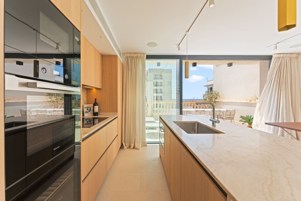 Das Herzstück dieses stilvollen Stadthauses liegt im dritten Obergeschoss: eine lichtdurchflutete Koch- und Esslandschaft mit maßgefertigter, offener Küche – ausgestattet mit modernsten Miele-Geräten und edelsten Materialien. Der Raum öffnet sich zur sonnigen und großen Außenterrasse – perfekt für entspannte Nachmittage oder einen Aperitif im goldenen Abendlicht, für das Mallorca so bekannt ist.
