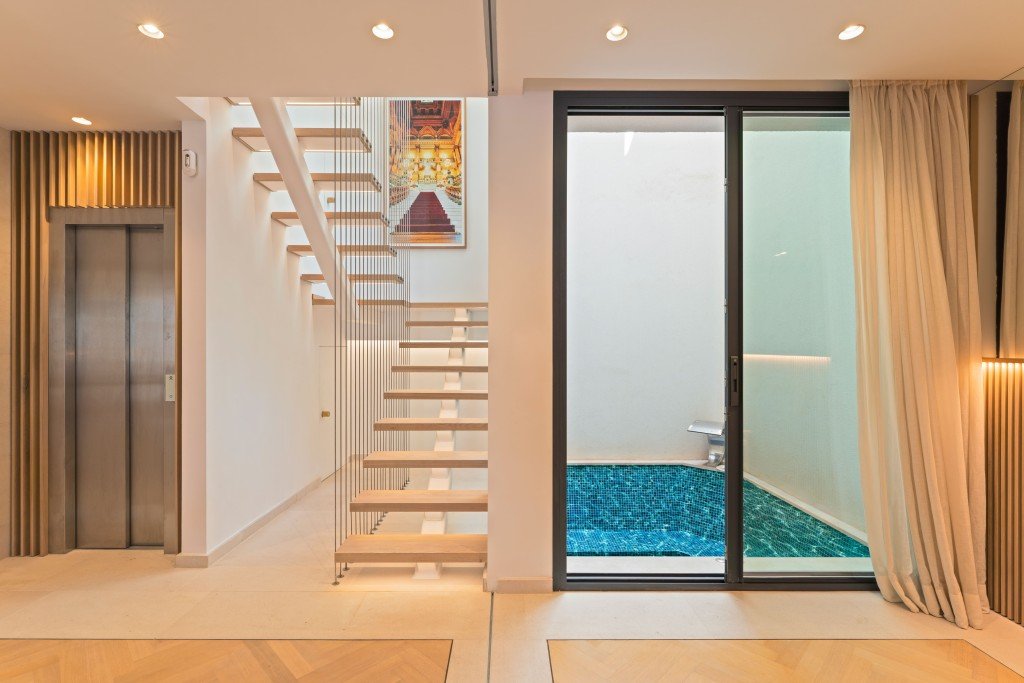Das Haus erstreckt sich über vier Etagen plus Dachterrasse mit Pool – alle bequem erreichbar über einen privaten Lift. Ein diskreter Luxus, der Komfort auf allen Ebenen garantiert.