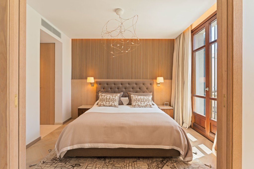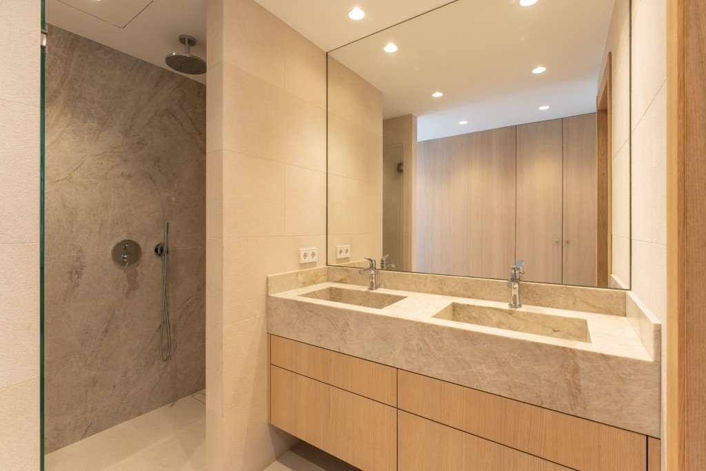 Insgesamt drei großzügige Schlafzimmer, alle mit Bad en Suite, bieten höchsten Komfort. Zwei davon befinden sich im ersten Obergeschoss mit Zugang zu einem privaten Balkon. Die gesamte zweite Etage ist der imposanten Master-Suite vorbehalten: mit begehbarem Ankleidezimmer, modernem Bad, lichtdurchflutetem Wohnbereich mit Kamin und privatem Balkon.