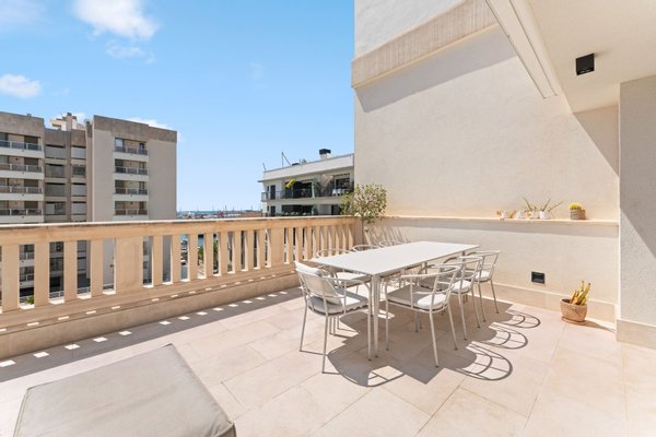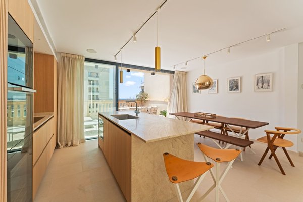 Das Herzstück dieses stilvollen Stadthauses liegt im dritten Obergeschoss: eine lichtdurchflutete Koch- und Esslandschaft mit maßgefertigter, offener Küche – ausgestattet mit modernsten Miele-Geräten und edelsten Materialien. Der Raum öffnet sich zur sonnigen und großen Außenterrasse – perfekt für entspannte Nachmittage oder einen Aperitif im goldenen Abendlicht, für das Mallorca so bekannt ist.