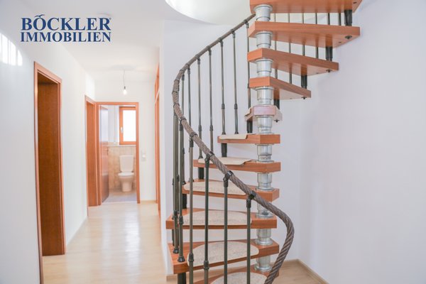 Eine Wendeltreppe führt in das lichtdurchflutete Dachstudio.