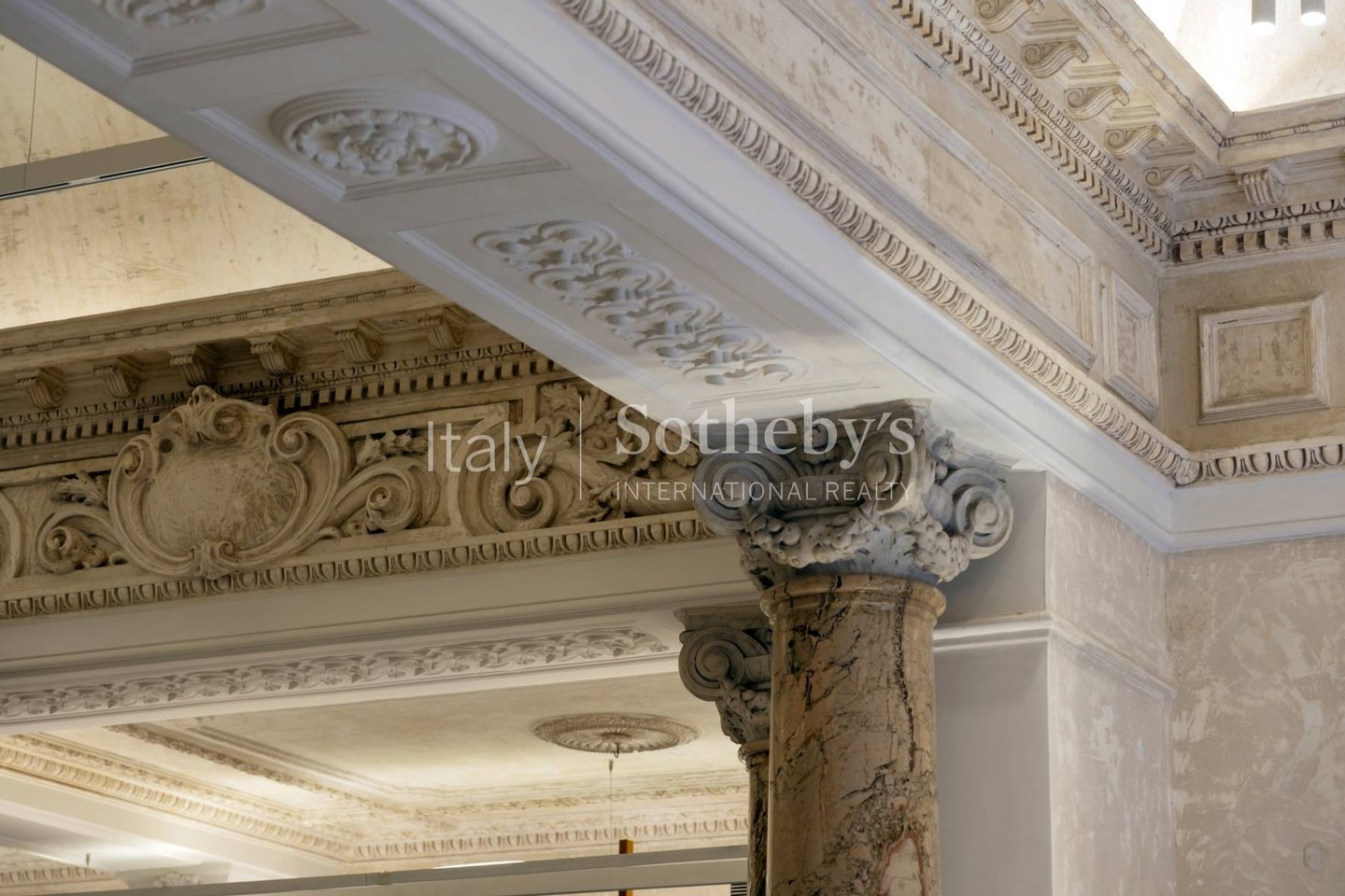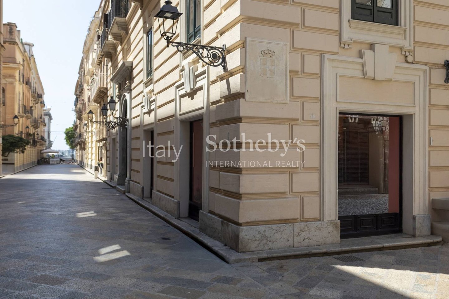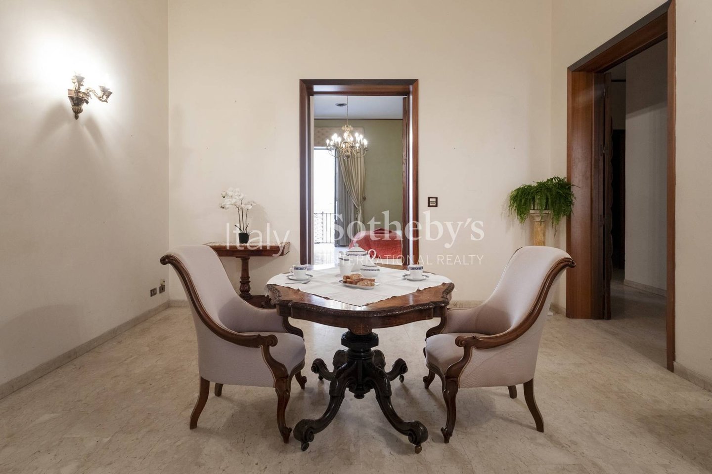 Das Hauptgeschoss verzaubert mit hohen Decken, großen Fenstern und originalen dekorativen Details, die die zeitlose Eleganz sizilianischer Aristokratenhäuser widerspiegeln. Die Fassade mit klassischen Linien, gebrochenen Giebeln, Gesimsbändern und schmiedeeisernen Balkonen vermittelt die zurückhaltende Großartigkeit historischer Paläste.