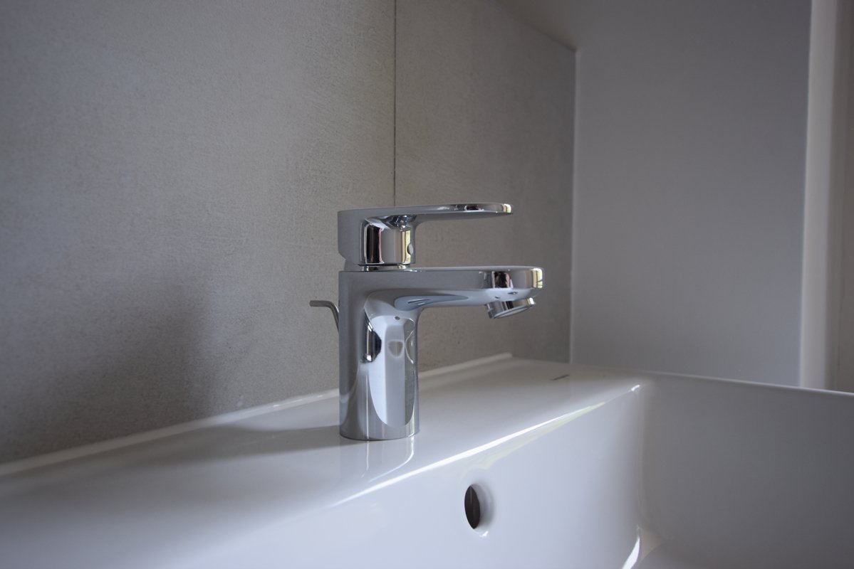 Das geflieste Badezimmer verfügt über moderne Sanitärobjekte sowie eine Dusche.