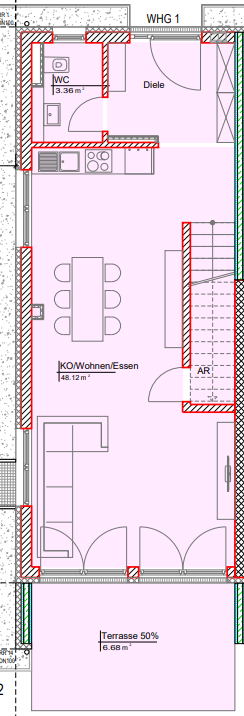 Die Wohnung Nr. 01 erstreckt sich über zwei Etagen und bietet eine durchdachte Raumaufteilung. Im Erdgeschoss befindet sich eine Diele mit angrenzendem Gäste-WC. Der großzügige Wohn-, Ess- und Kochbereich bildet das Zentrum der Wohnung und ermöglicht den direkten Zugang zur Terrasse.Im Obergeschoss stehen drei Schlafzimmer zur Verfügung, die individuell als Kinder-, Arbeits- oder Gästezimmer genutzt werden können. Ein großes Badezimmer ergänzt das Raumangebot und sorgt für zusätzlichen Komfort.