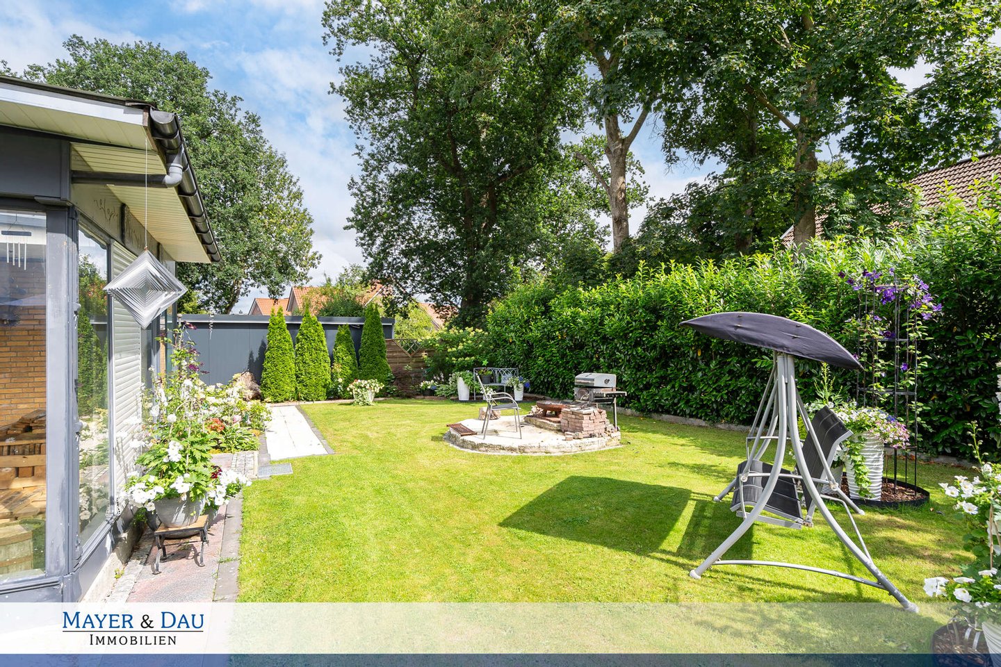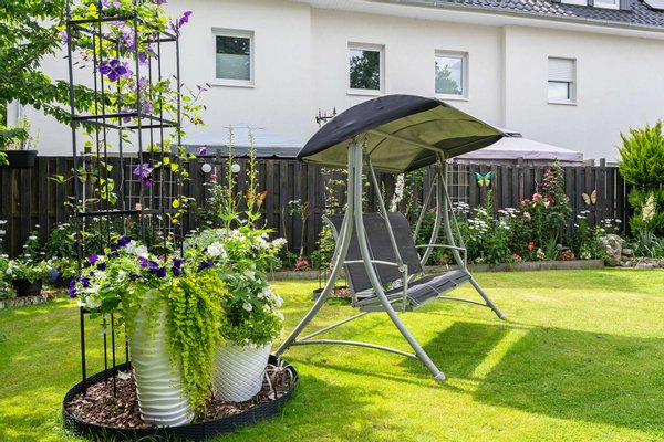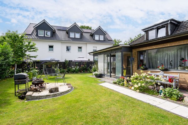 Der Garten erstreckt sich hinter dem Haus sowie seitlich entlang und schafft eine wunderbare Verbindung zur Natur. Üppiges Grün, liebevoll angelegte Beete und Platz für gemütliche Sitzecken, Spielbereiche oder Gartenträume machen diesen Außenbereich zu einem besonderen Rückzugsort. Ein kleiner Vorgarten und eine eigene Garage runden dieses attraktive Angebot ab.