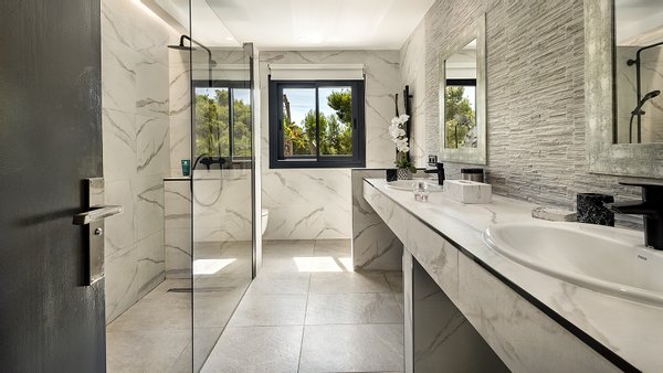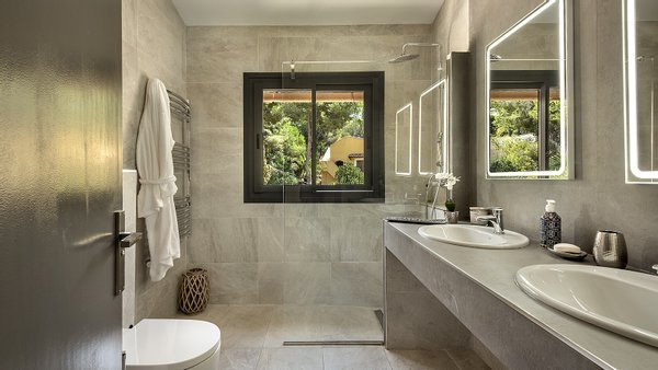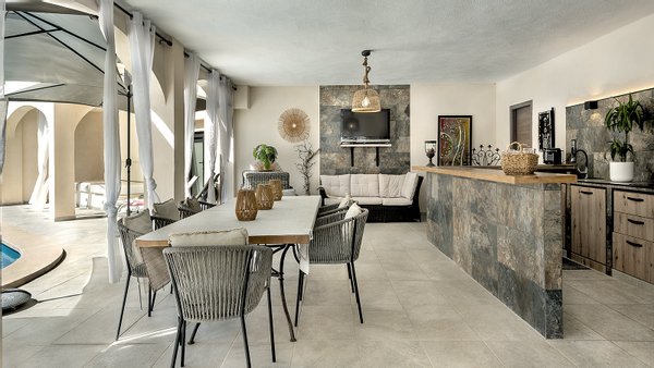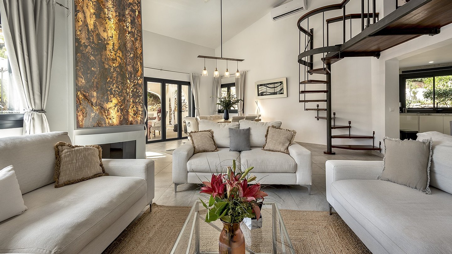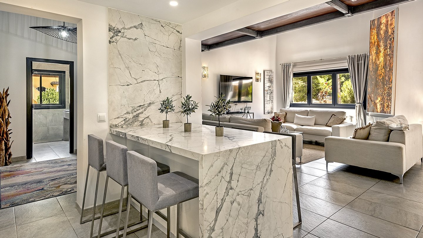 Die Immobilie verfügt über insgesamt vier Schlafzimmer und drei Badezimmer, wobei eines der Badezimmer als en-suite direkt an das Hauptschlafzimmer angeschlossen ist - ideal für maximalen Komfort und Privatsphäre. Ein Gäste WC ist ebenfalls vorhanden .Im Innenbereich überzeugt die Villa durch eine hochwertige und durchdachte Ausstattung. Eine moderne, offene Einbauküche mit hochwertigen Elektrogeräten fügt sich harmonisch in den großzügigen Wohnbereich mit offenem Kamin ein - perfekt für gemütliche Abende. Großformatige Fliesenböden schaffen ein stilvolles und pflegeleichtes Wohnambiente. Dank des durchdachten Raumkonzepts mit Hauswirtschafts- und Abstellraum sowie Einbauschränke in den Räumlichkeiten  mangelt es nicht an Stauraum. Zusätzlich stehen ein Keller und ein weiterer Raum zur Verfügung, die vielseitig genutzt werden können. Eine Klimaanlage mit Warm- und Kaltfunktion sorgt das ganze Jahr über für ein angenehmes Raumklima und wird durch eine effiziente Ölzentralheizung ergänzt. Doppelt verglaste Aluminiumfenster mit dazu passenden Aluminiumblendläden bieten hervorragenden Schall- und Wärmeschutz. Der Außenbereich dieser Villa überzeugt mit einer Vielzahl attraktiver Ausstattungsmerkmale , die sowohl Komfort als auch Lebensqualität unter freiem Himmel garantieren. Ein großzügiger Pool mit angrenzender Außendusche lädt an warmen Tagen zum Erfrischen ein. Die gut ausgestattete Sommerküche und  BBQ-Bereich bieten ideale Voraussetzungen für gesellige Abende mit Familie und Freunden. Abgerundet wird das Outdoor-Konzept durch eine stilvolle Chill-out-Lounge, die zum Entspannen und Verweilen einlädt - ein perfekter Ort, um das mediterrane Lebensgefühl in vollen Zügen zu genießen. Auch für ausreichend Parkmöglichkeiten ist gesorgt: Die Immobilie verfügt über zwei PKW-Stellplätze sowie zwei Garagenplätze, die durch ein elektrisches Zufahrtstor und ein automatisches Garagentor gesichert sind.