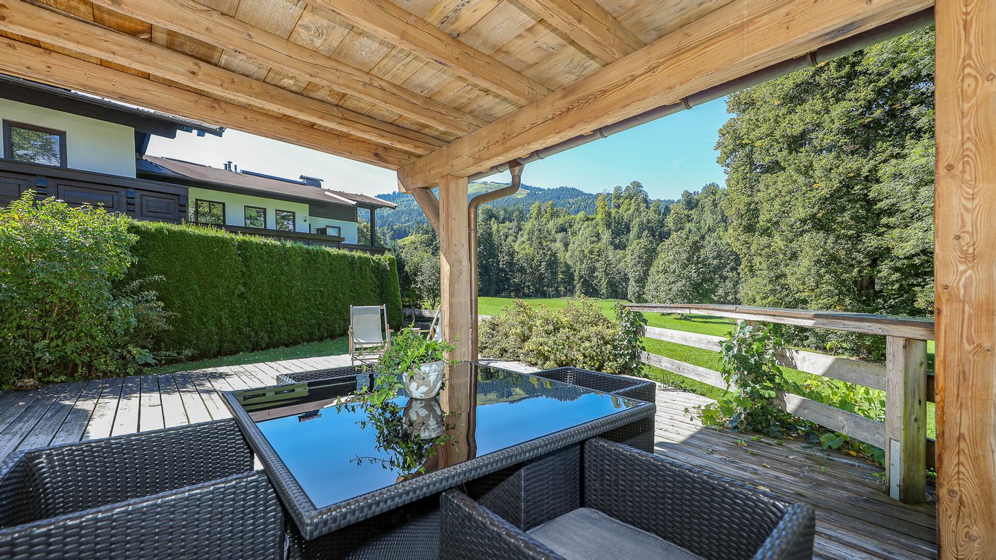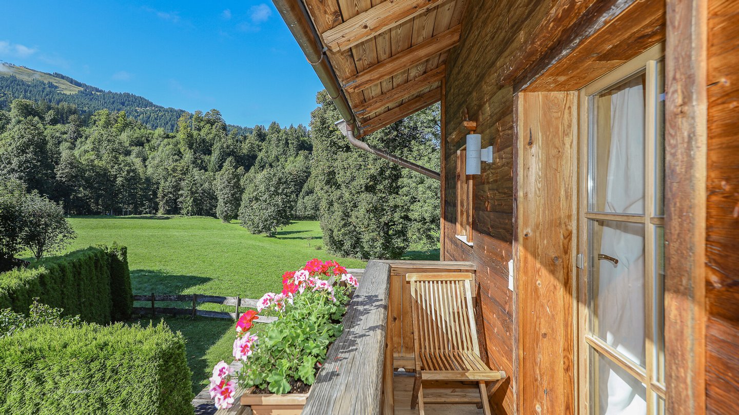 Vom Flur gelangt man auf einen Richtung Süden und Osten ausgerichteten Balkon, von welchem man einen traumhaften Ausblick auf den Wilden Kaiser hat.