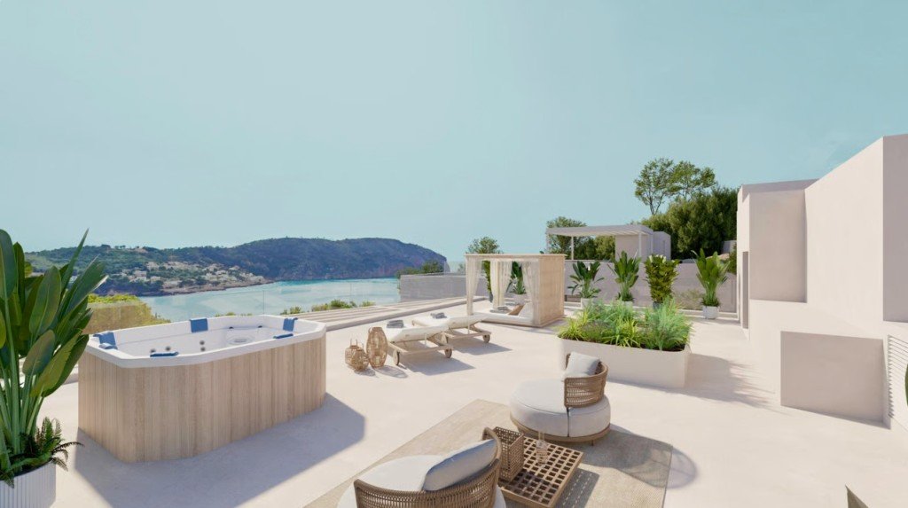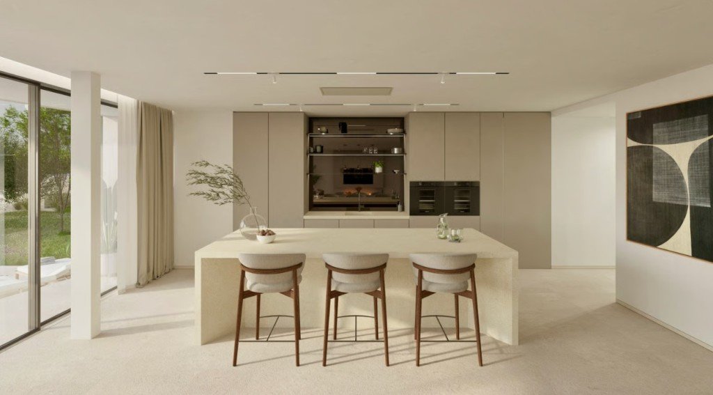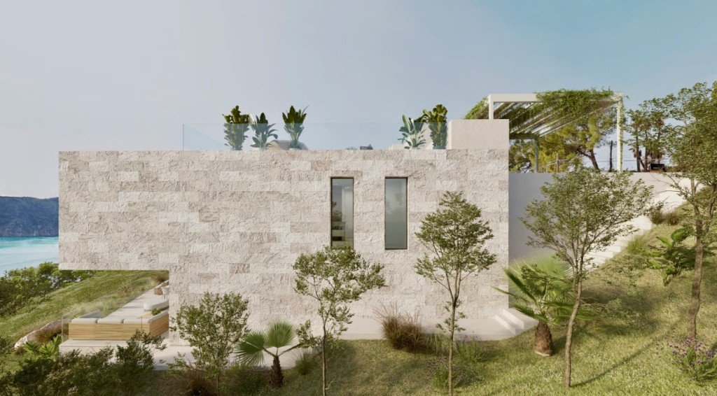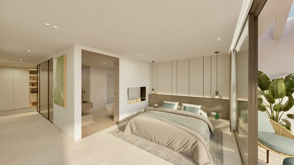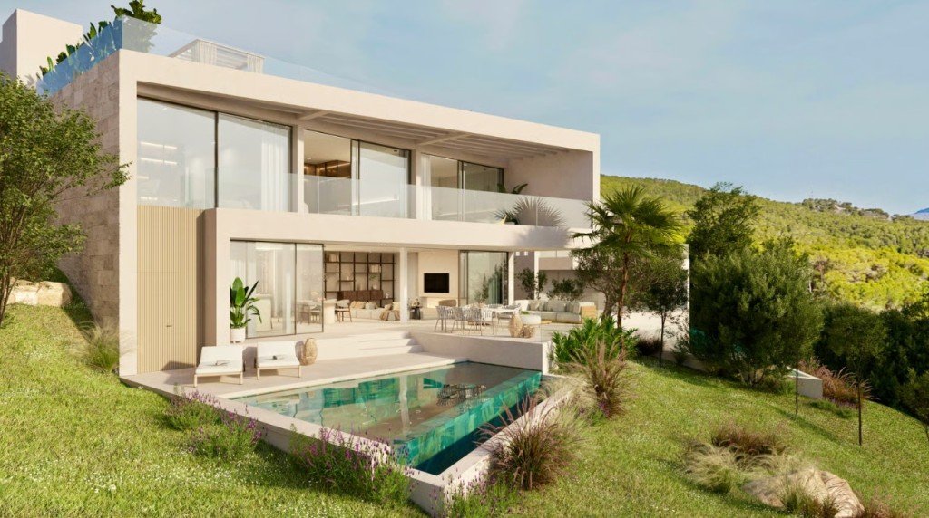 Die Architektur kombiniert moderne und traditionelle Materialien und erreicht so zeitlose Eleganz mit mediterranem Charme. Vier großzügige Schlafzimmer, jeweils mit en-suite Badezimmer, garantieren Privatsphäre und Entspannung für Bewohner und Gäste. Der offene Wohnbereich mit großen Panoramafenstern eröffnet ununterbrochene Ausblicke auf das Meer und die Landschaft, während ein Kamin im Salon für gemütliche Raffinesse sorgt. Das Untergeschoss bietet ausreichend Platz für einen exklusiven Wellnessbereich mit Fitnessraum, Sauna und Bodega.