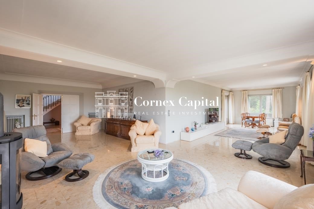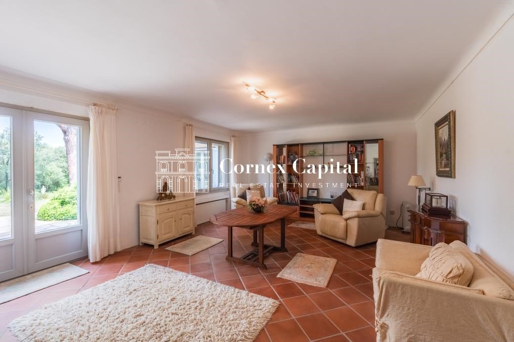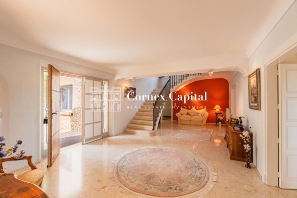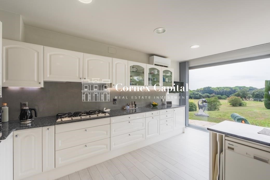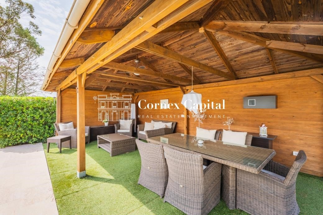 Draußen umgibt ein angelegter Garten mit automatischer Bewässerung den 40 m² großen Pool, der sich perfekt zum Entspannen inmitten der Natur eignet. Darüber hinaus führt ein Panoramaweg an das Anwesen heran, der ideale Orte für private Spaziergänge und Momente der Ruhe bietet.