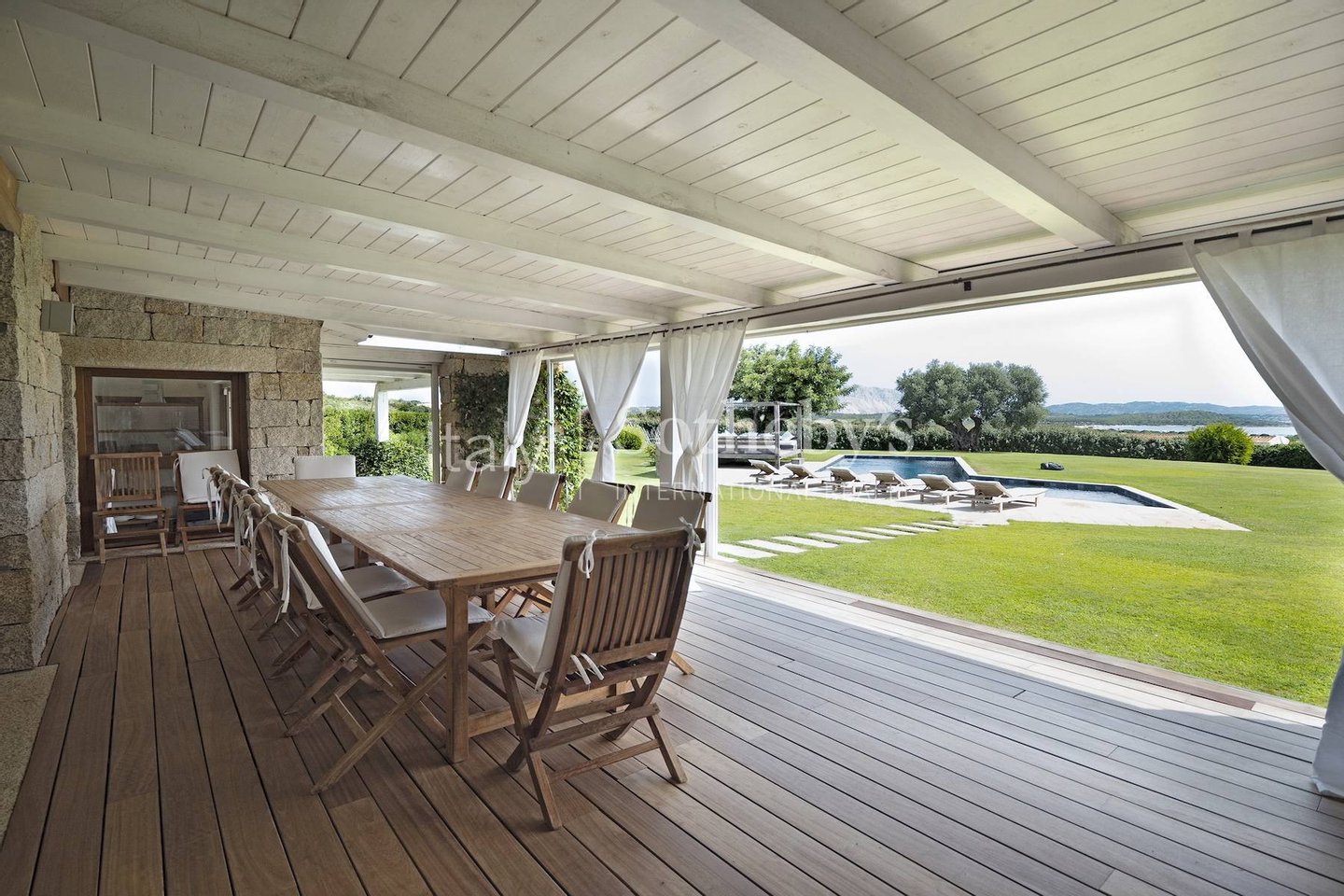 Die Villa ist über ein elektrisches Tor zugänglich, das sich zu einem großzügigen Eingangsbereich mit überdachtem Parkplatz für zwei Autos sowie weiteren Stellplätzen öffnet. Ein Steinweg führt durch den Garten zu einer geräumigen Veranda mit einem großen Holztisch für 12 Personen und einer hellen Outdoor-Lounge, die bei Wind geschlossen werden kann und eine angenehme Verbindung zwischen Wohn- und Schlafbereichen schafft. Der architektonische Stil erinnert an das traditionelle Stazzo Gallurese, neu interpretiert mit modernen Elementen.