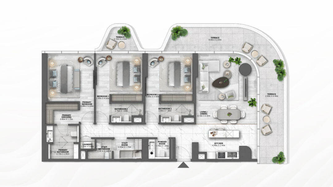Willkommen in diesem luxuriösen Apartment mit drei Schlafzimmern, das ideal für Familien und Investoren geeignet ist. Neben den großzügigen Räumen und hochwertigen Ausstattungen beeindruckt dieses Objekt mit einem zusätzlichen Zimmer für das Personal - ein echtes Highlight für anspruchsvolle Käufer. Freuen Sie sich auf ein stilvolles und komfortables Wohnambiente, das keine Wünsche offen lässt.