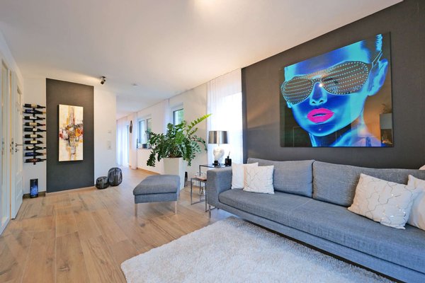 Die außergewöhnliche Wohnung befindet sich im 1. Obergeschoss und Dachgeschoss eines in 2021 erbauten Zweifamilienhauses und verfügt über 4 Zimmer. Große Fensterfronten lassen reichlich Tageslicht in die Räume strömen und schaffen eine äußerst