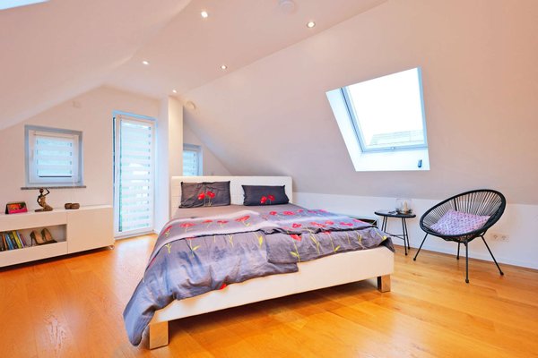 Im Dachgeschoss befinden sich zwei großzügige Schlafzimmer, die durch das elegante Masterbad mit hochwertiger Ausstattung ergänzt werden. Dieses Bad ist ein wahres Highlight – ein Rückzugsort zum Entspannen und Erholen beziehungsweise in den Tag zu starten.