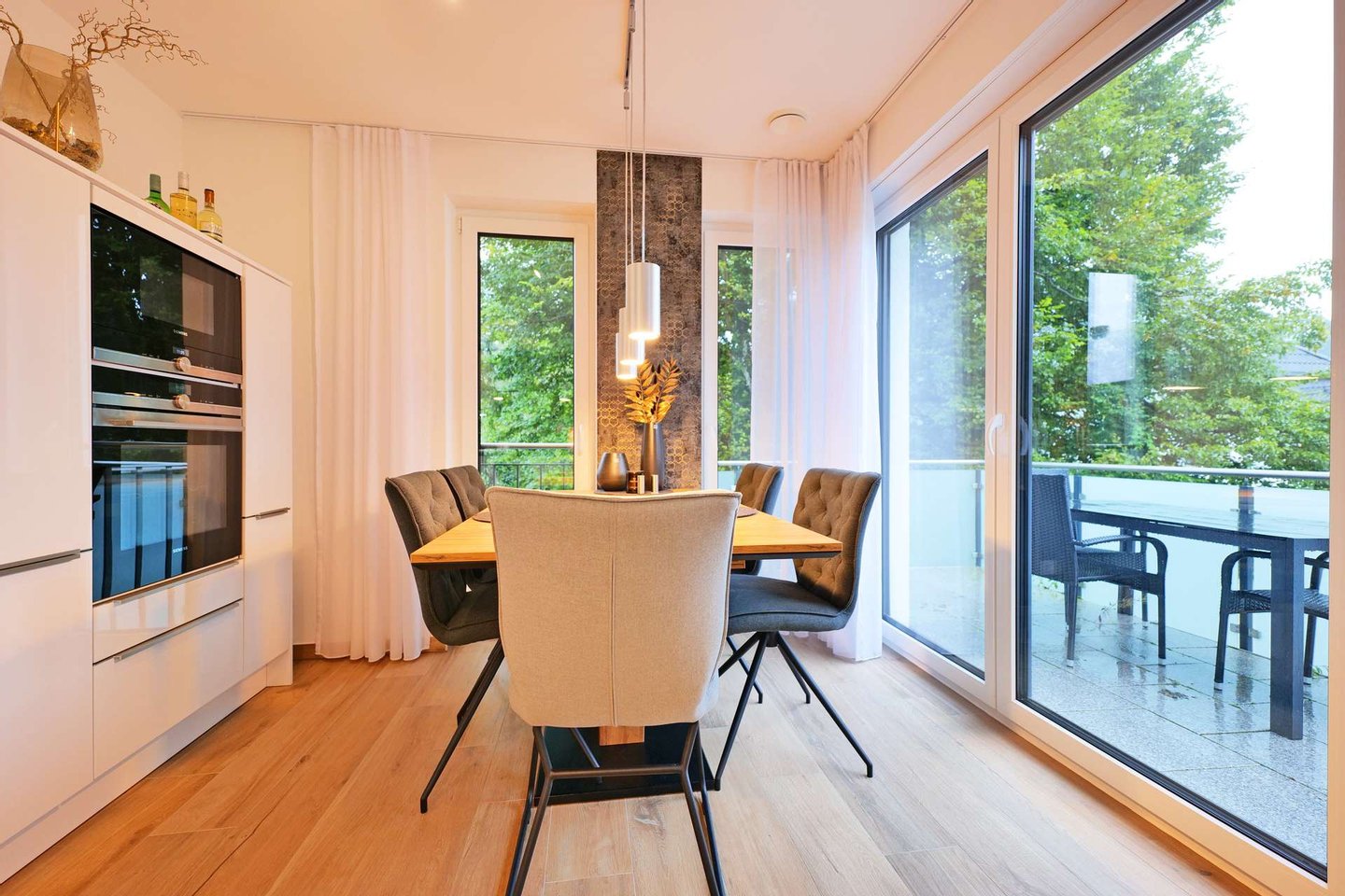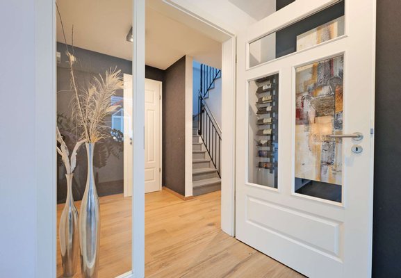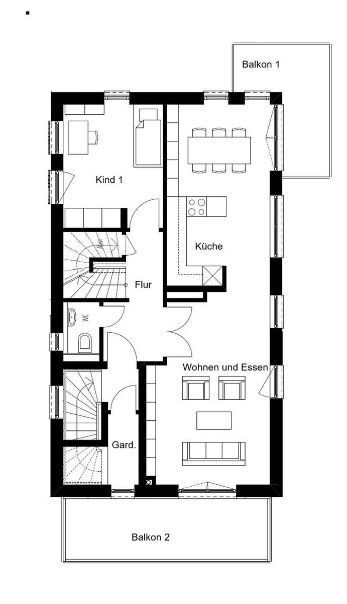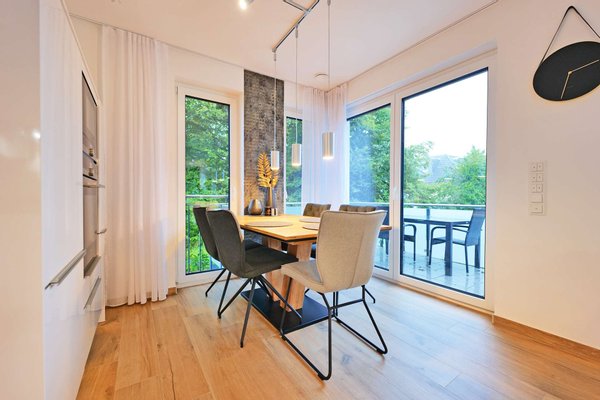 Im 1. Obergeschoss erwartet Sie ein lichtdurchfluteter, offener Wohn- und Essbereich. Dieser beeindruckt durch seine Weitläufigkeit und bietet zugleich zwei Zugänge zu den sonnigen Balkonen, die sich perfekt für entspannte Stunden im Freien eignen. Dank der Südausrichtung genießen Sie den ganzen Tag über reichlich Sonnenlicht. Das Gäste-WC auf dieser Etage sorgt für zusätzlichen Komfort.