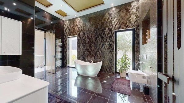 ++ Das Haus verfügt über 3 vollwertige Badezimmer, ausgestattet mit hochwertigen Duschen und WCs. Das Master-Bad offeriert zusätzlich eine freistehende, luxuriöse Badewanne für besonderen Komfort.