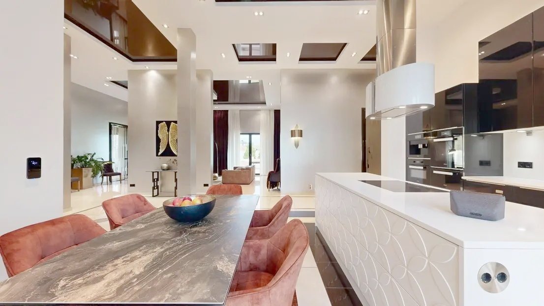 Die massiv errichtete Immobilie selbst besteht aus Beton und Kalksandstein. Sie besticht durch eine hohe Bauqualität und Langlebigkeit. Die beeindruckende Raumhöhe von 4 Metern verleiht dem Haus ein großzügiges und offenes Raumgefühl, während die leicht getönten Fensterscheiben mit Alufensterrahmen für angenehmes Licht und Sonnenschutz sorgen. Die Immobilie ist voll unterkellert und offeriert zusätzlichen Stauraum mit flexiblen Nutzungsoptionen. Abgerundet wird diese außergewöhnlich luxuriöse Immobilie über eine großzügige Doppelgarage, welche Ihre Fahrzeuge schützt und Ihnen ausreichend Platz für zusätzliche Lagermöglichkeiten bietet. Im Außenbereich gibt es eine vollüberdachte Terrasse.