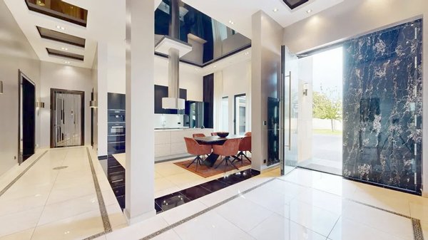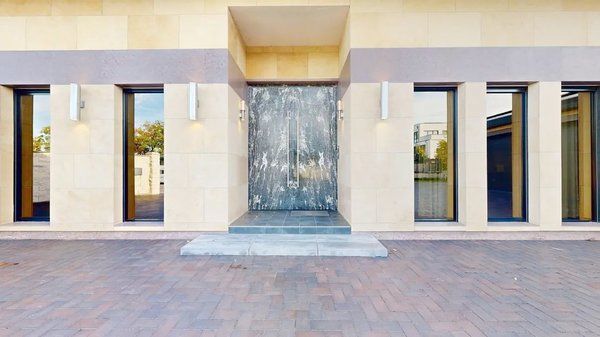 ++ Die maßgefertigte Eingangstür aus edlem Marmor (Nero Portoro) setzt bereits beim Betreten der Villa ein eindrucksvolles Statement.