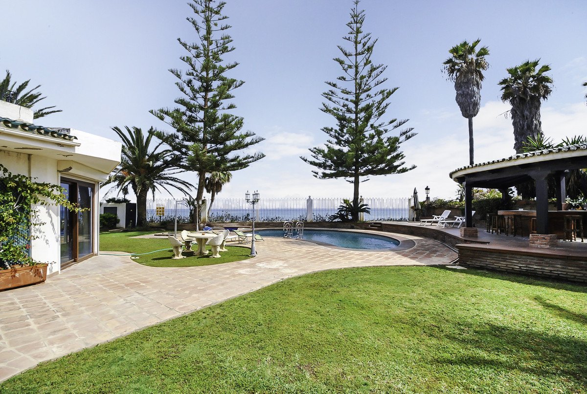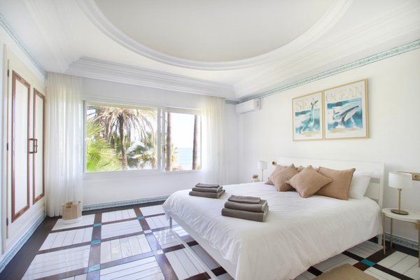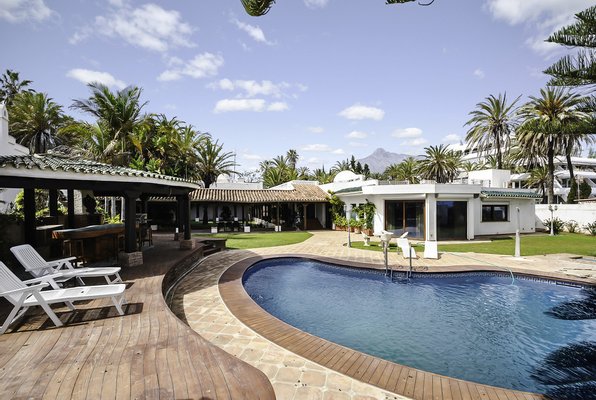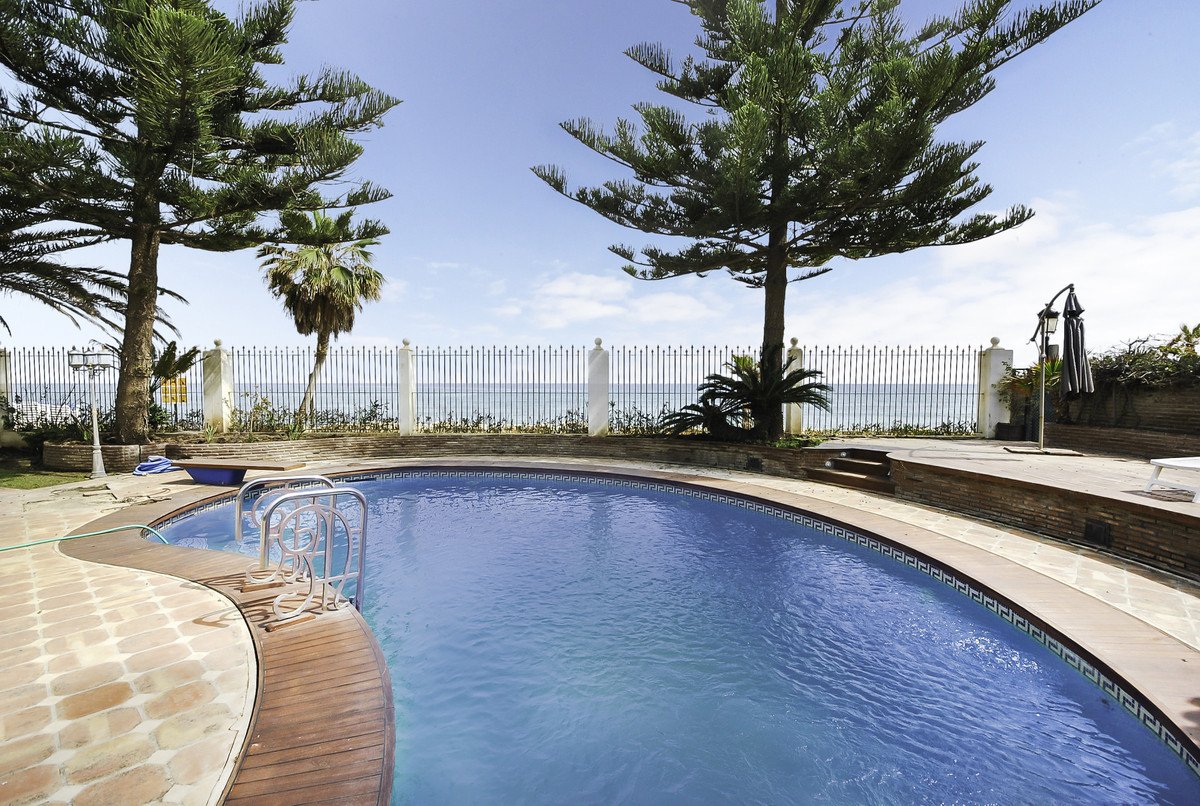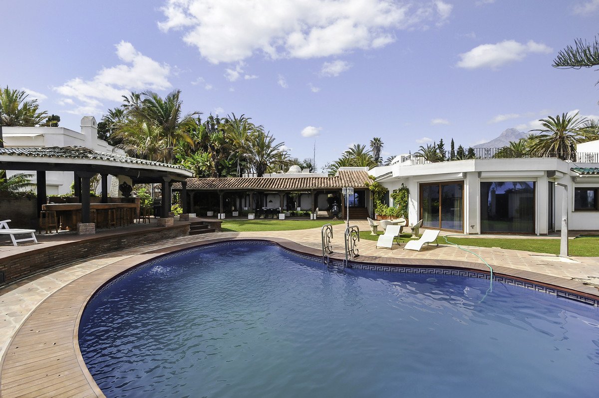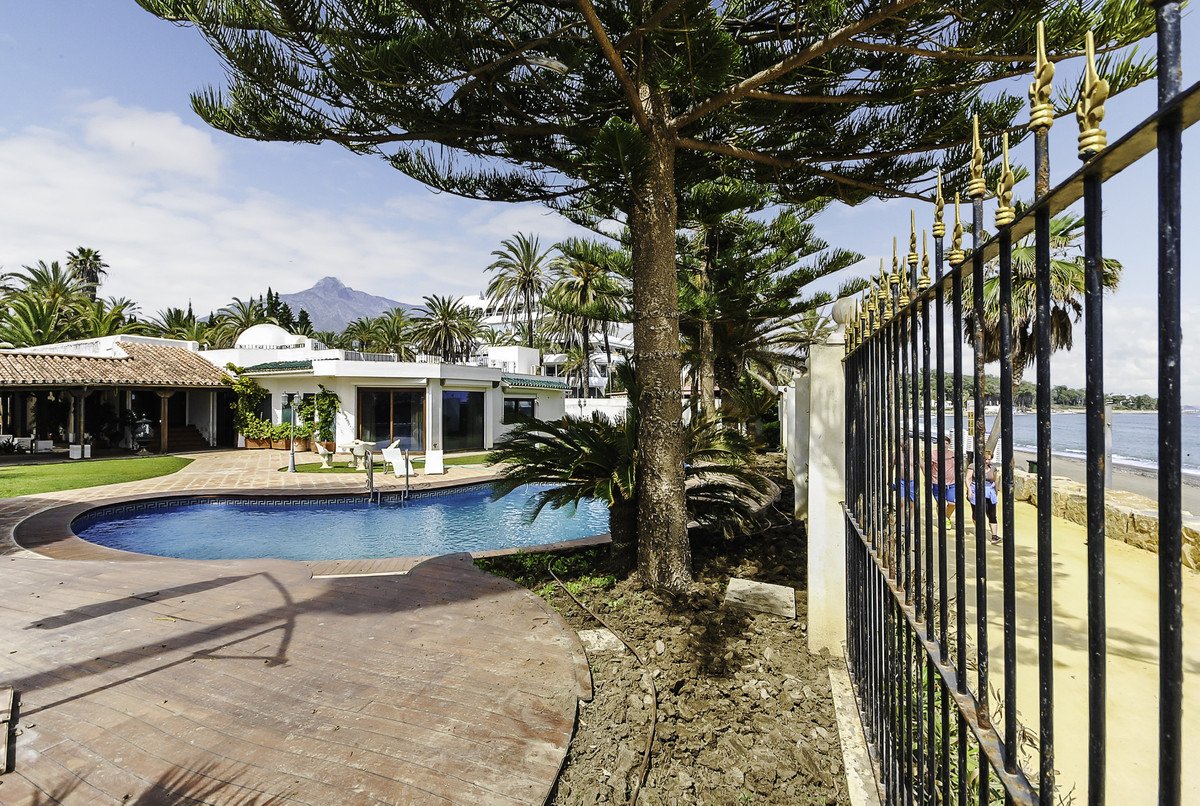 A very spacious & unique villa situated in an unrivalled front line beach position in one of Spain's most privileged location, Marbella's exclusive Golden Mile. The villa is set on a double plot and offers on the ground level an entry hall, a guest toilet, office, spacious living room leading onto the garden with various terraces, swimming pool, bar, and direct access to the promenade. On this floor there is a separate dining room with vaulted skylight ceiling, a fully equipped kitchen with separate entrance, the master suite with walking wardrobes, 2 further double en suite bedrooms, and 2 bedrooms sharing a bathrooms. On this level there are two self contained guest apartments with 2 bedroom suites and living area, as well as a garage for four cars. These apartments are accessed separately form the main house. On this level we will also find a separate area with cinema room, an industrial kitchen with storeroom and 2 toilets. On the upper level there is a guest apartment with kitchenette, 2 en-suite bedrooms and a storeroom.The guest house is completely independent and consists of an ample living room, a fully equipped kitchen, both with access to the terrace and garden, an en-suite double bedroom on the main floor and 3 further en-suite bedrooms upstairs. The staff house offers 2 en-suite bedrooms, 2 rooms that can be used as gymnasium or multi-purpose room. Impossible to find a more prestigious and desirable location anywhere on the Costa del Sol. Simply unique!Our Professional Process & Client Commitment
