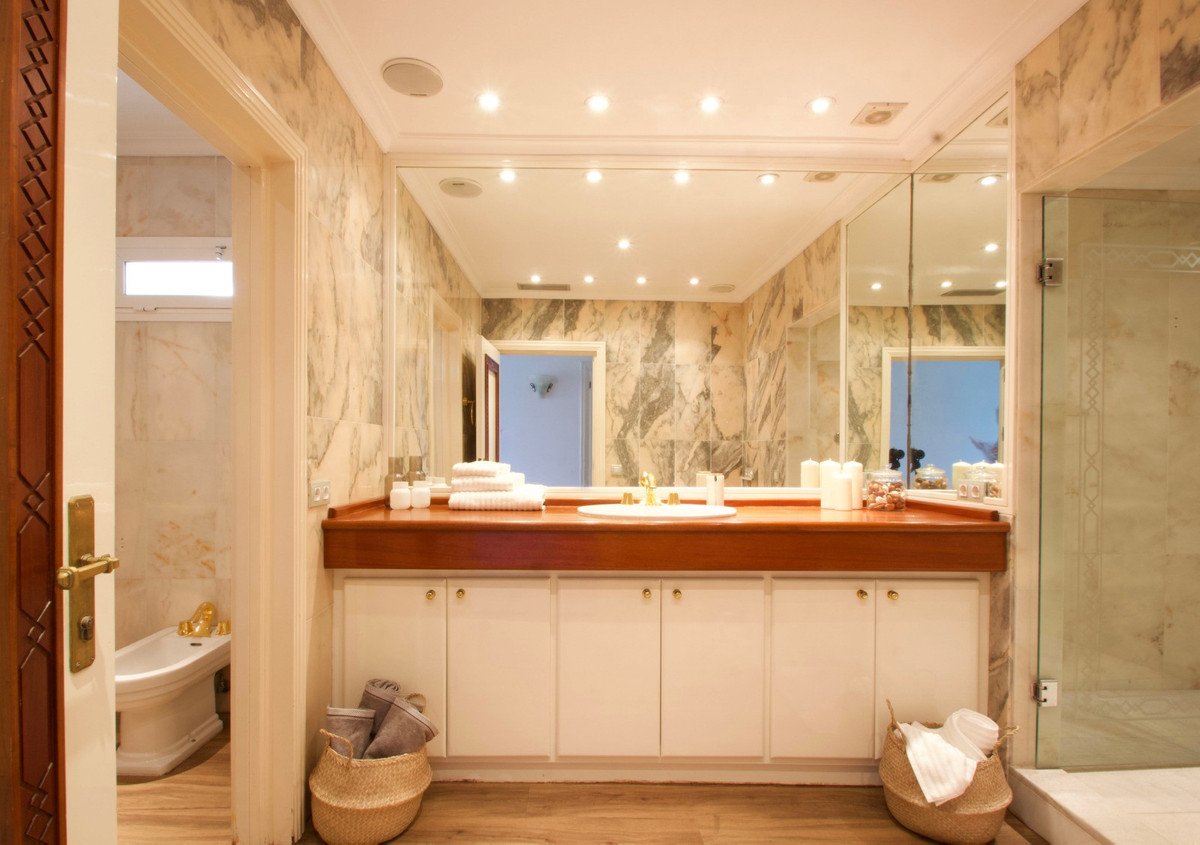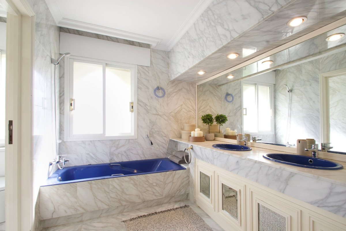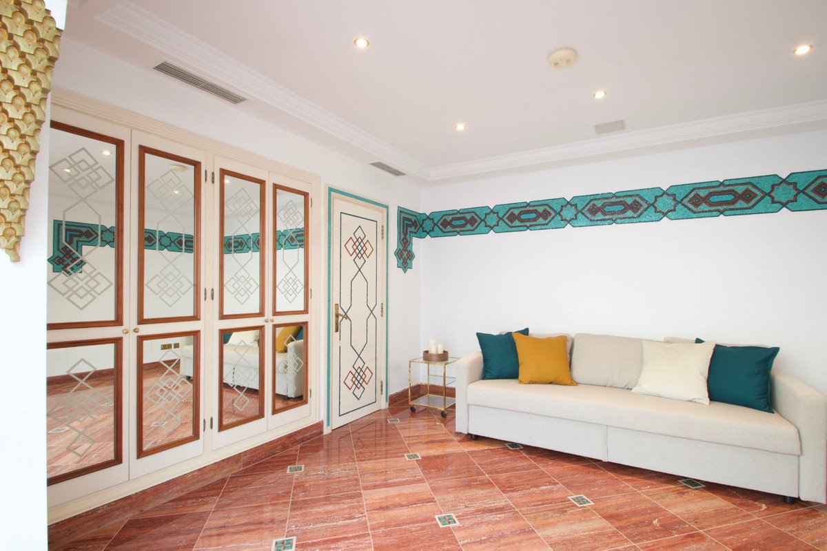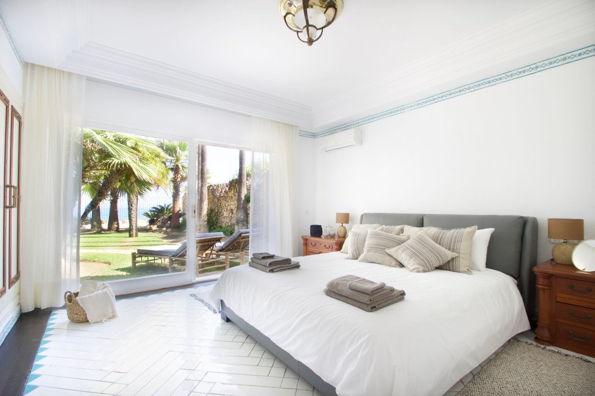 A very spacious & unique villa situated in an unrivalled front line beach position in one of Spain's most privileged location, Marbella's exclusive Golden Mile. The villa is set on a double plot and offers on the ground level an entry hall, a guest toilet, office, spacious living room leading onto the garden with various terraces, swimming pool, bar, and direct access to the promenade. On this floor there is a separate dining room with vaulted skylight ceiling, a fully equipped kitchen with separate entrance, the master suite with walking wardrobes, 2 further double en suite bedrooms, and 2 bedrooms sharing a bathrooms. On this level there are two self contained guest apartments with 2 bedroom suites and living area, as well as a garage for four cars. These apartments are accessed separately form the main house. On this level we will also find a separate area with cinema room, an industrial kitchen with storeroom and 2 toilets. On the upper level there is a guest apartment with kitchenette, 2 en-suite bedrooms and a storeroom.The guest house is completely independent and consists of an ample living room, a fully equipped kitchen, both with access to the terrace and garden, an en-suite double bedroom on the main floor and 3 further en-suite bedrooms upstairs. The staff house offers 2 en-suite bedrooms, 2 rooms that can be used as gymnasium or multi-purpose room. Impossible to find a more prestigious and desirable location anywhere on the Costa del Sol. Simply unique!Our Professional Process & Client Commitment