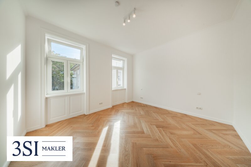 Die charakteristischen Elemente der Jahrhundertwende-Architektur – hohe Räume, Fischgrätparkett, Flügeltüren – sind teilweise erhalten und unterstreichen den einzigartigen Stil des Hauses.