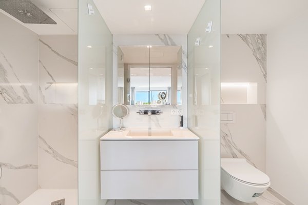 Jedes Detail spiegelt Qualität wider, von den doppelt verglasten Aluminiumfenstern und Porzellanfliesenböden bis hin zur Fußbodenheizung, den Einbauschränken und der Klimaanlage für ganzjährigen Komfort. Die Bewohner profitieren außerdem von einem großen Gemeinschaftspool mit Sonnenterrassen.