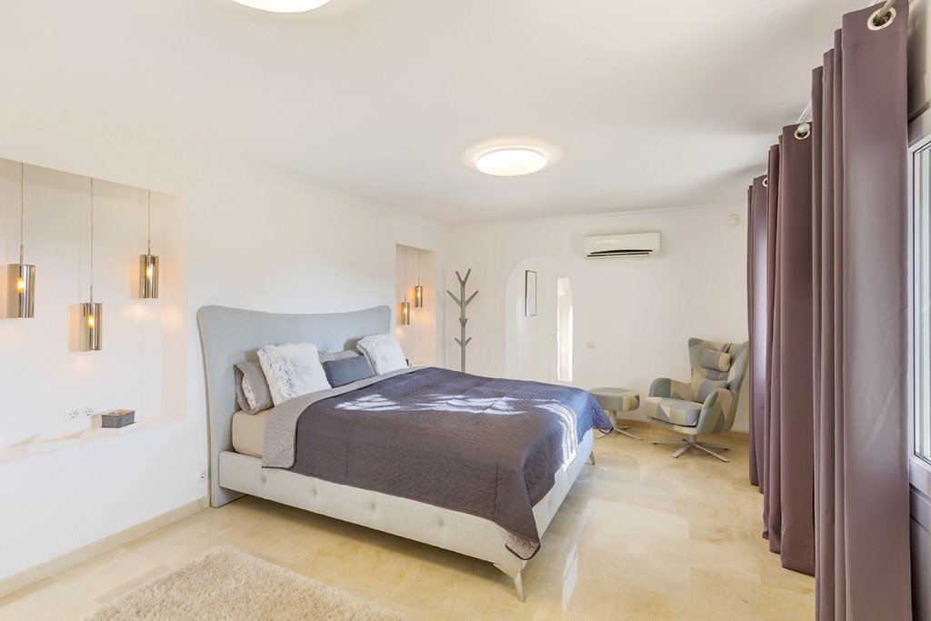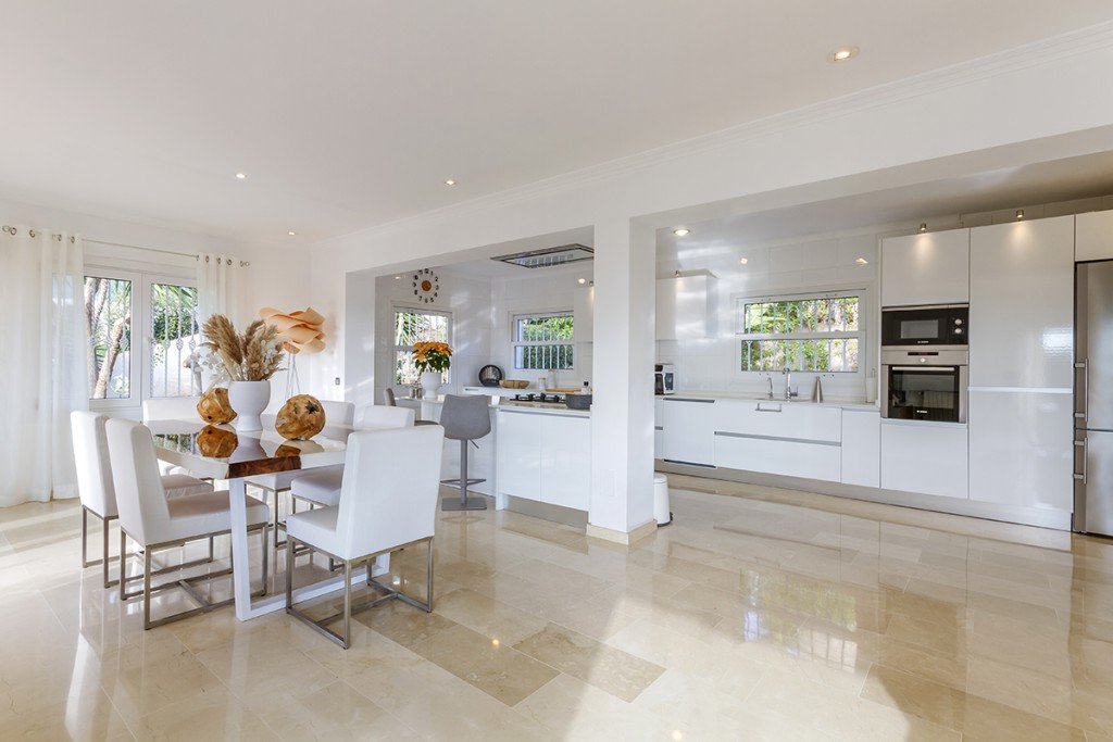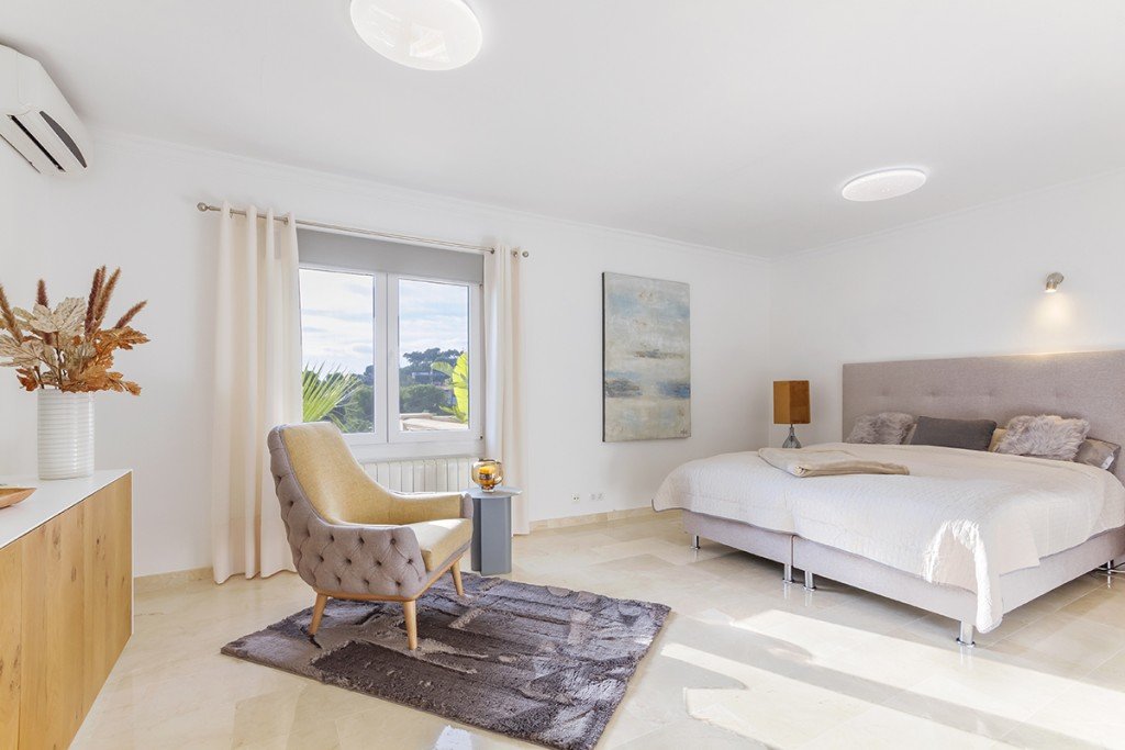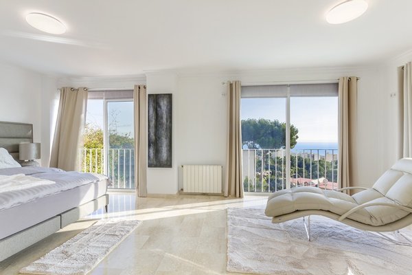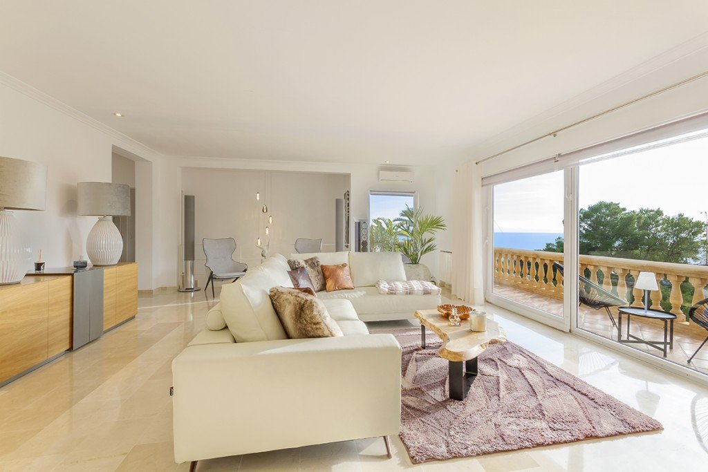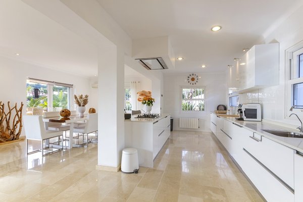 Die Villa wurde mit einem anspruchsvollen, lichtdurchfluteten Interieur renoviert. Im Inneren finden Sie eine Eingangshalle, fünf Doppelschlafzimmer, vier Badezimmer, eine moderne Küche mit integrierten Geräten, eine Frühstücksbar und einen Essbereich sowie ein geräumiges Wohnzimmer mit großen Schiebetüren, die direkt auf die Terrasse mit Meerblick führen.