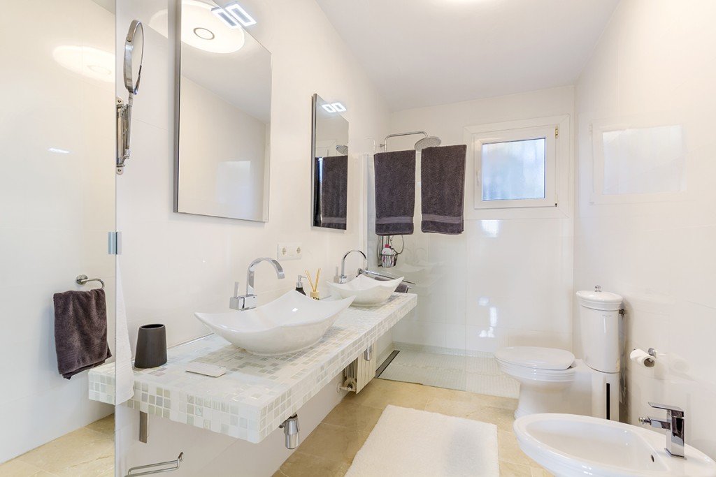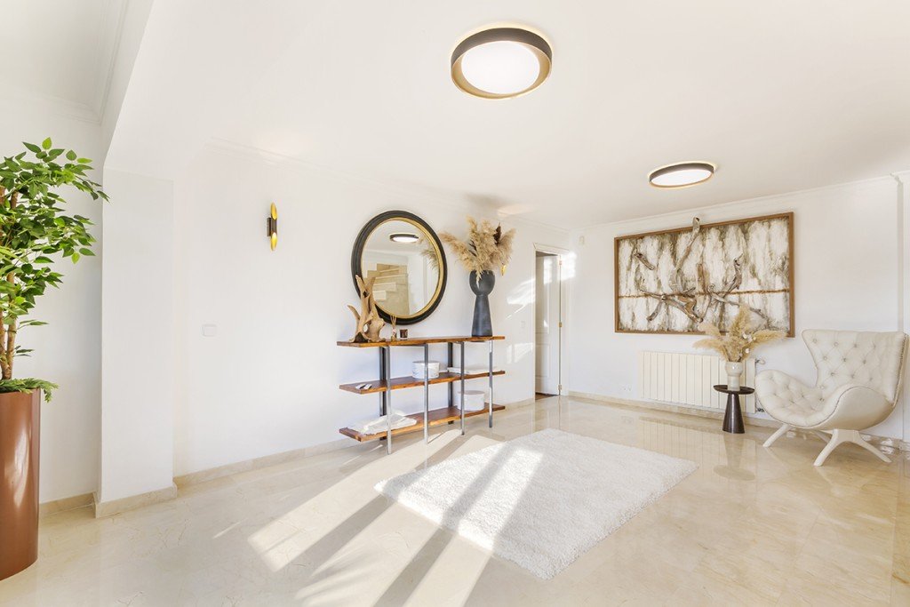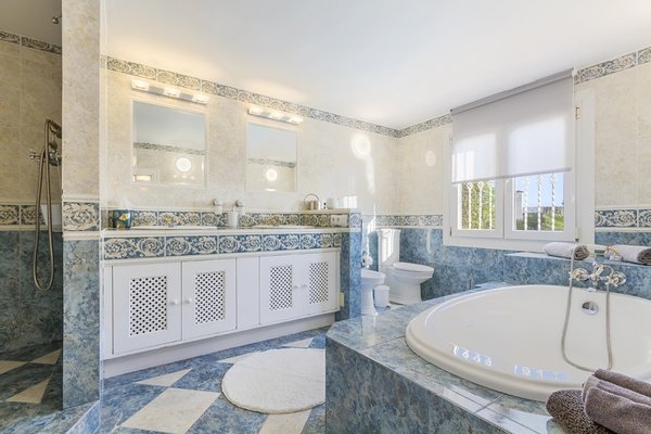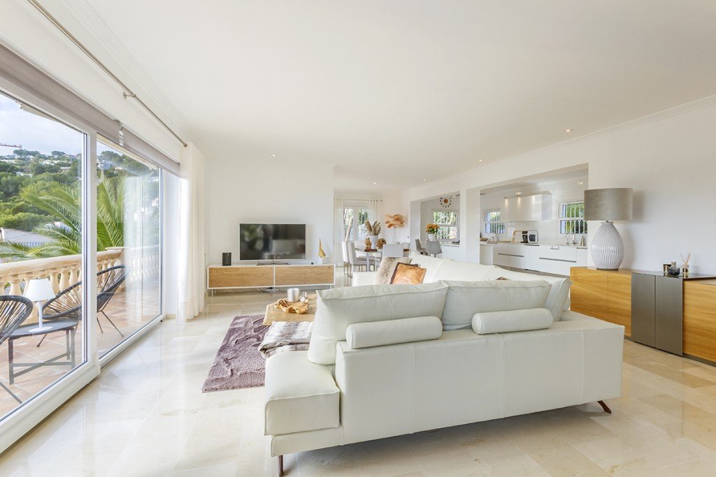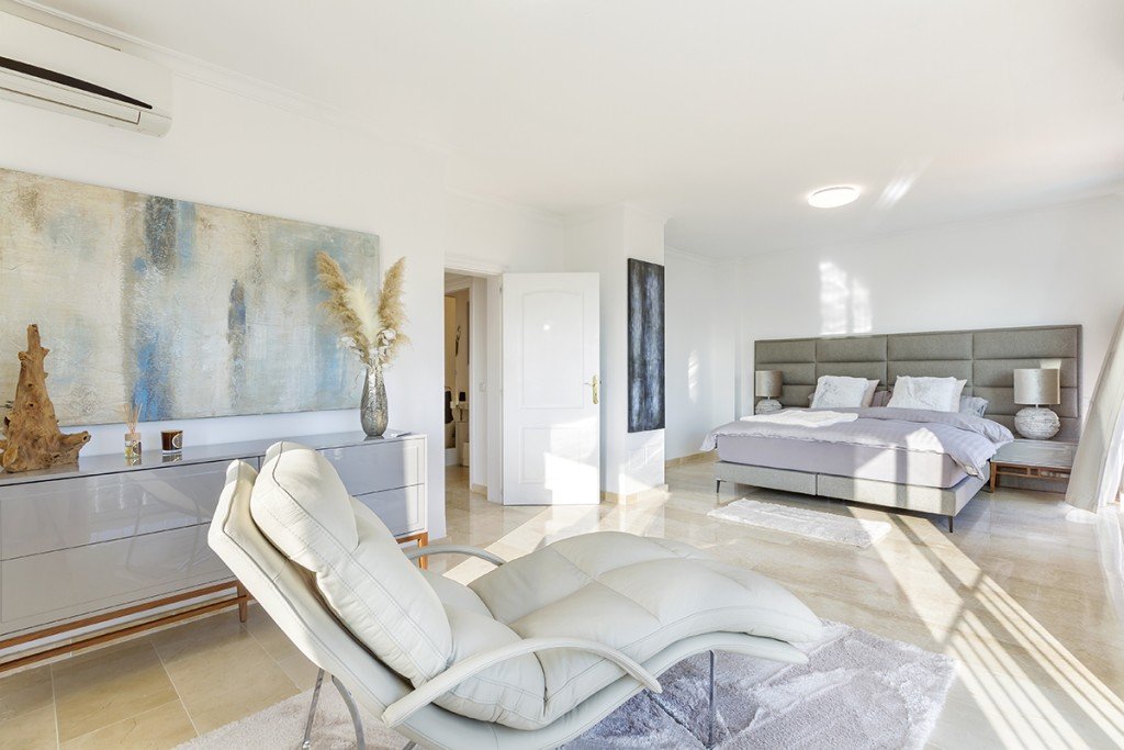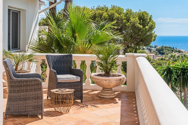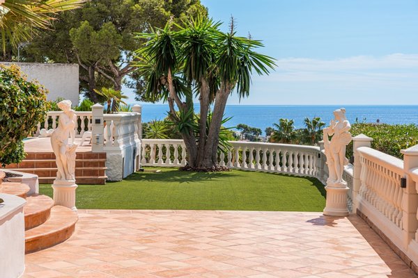 Die Villa wurde mit einem anspruchsvollen, lichtdurchfluteten Interieur renoviert. Im Inneren finden Sie eine Eingangshalle, fünf Doppelschlafzimmer, vier Badezimmer, eine moderne Küche mit integrierten Geräten, eine Frühstücksbar und einen Essbereich sowie ein geräumiges Wohnzimmer mit großen Schiebetüren, die direkt auf die Terrasse mit Meerblick führen.