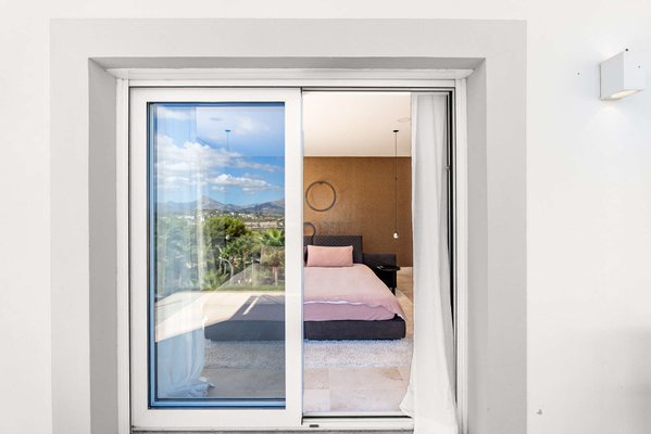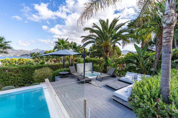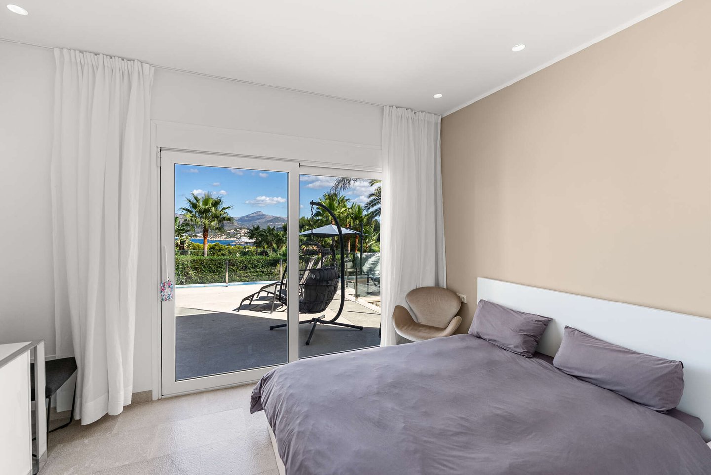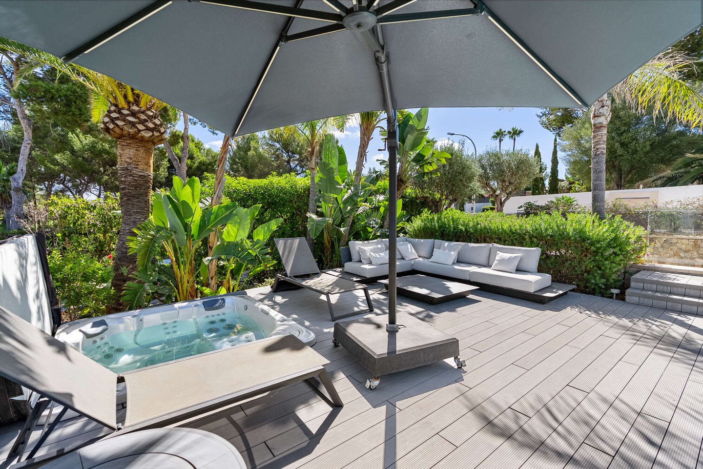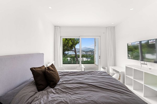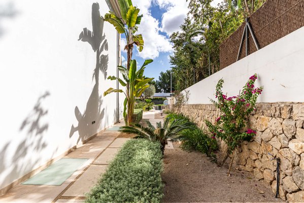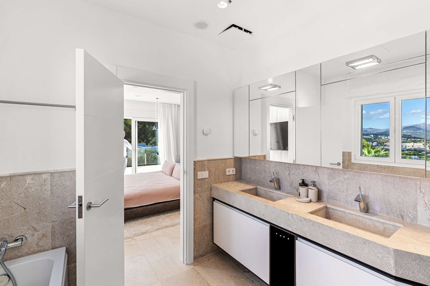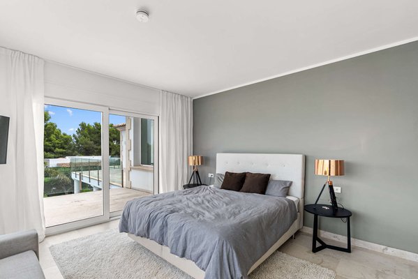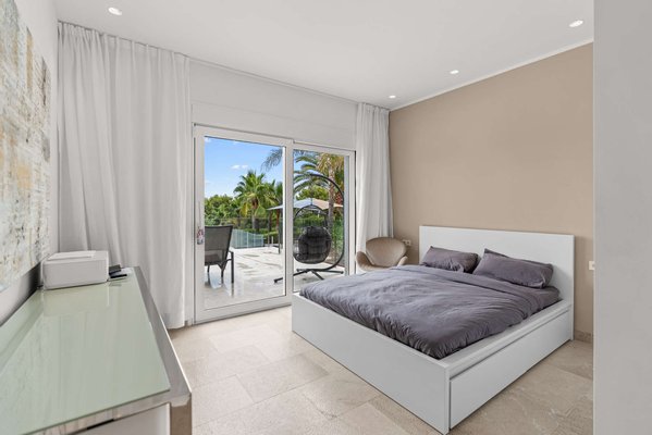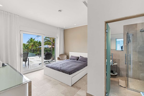 Zwei stilvolle Schlafzimmer mit en-suite Bädern und direktem Zugang zum liebevoll gestalteten Gartenbereich mit weitläufigen Sonnenterrassen und einem privaten Infinity-Pool schaffen eine luxuriöse Wohlfühlatmosphäre – perfekt, um Mallorcas Sonnentage in absoluter Privatsphäre zu genießen.