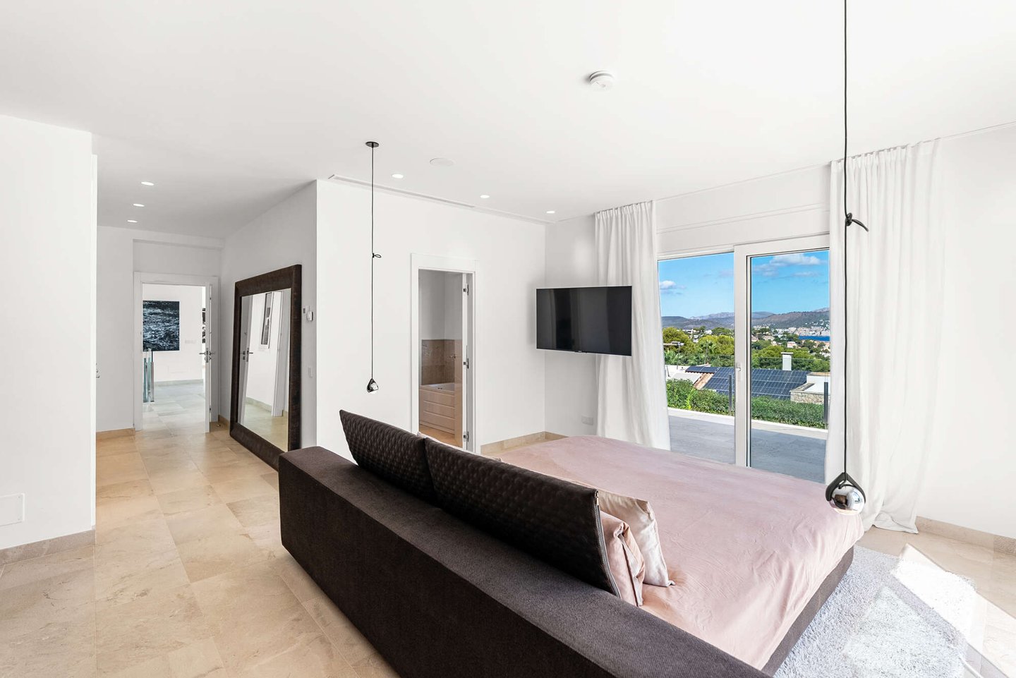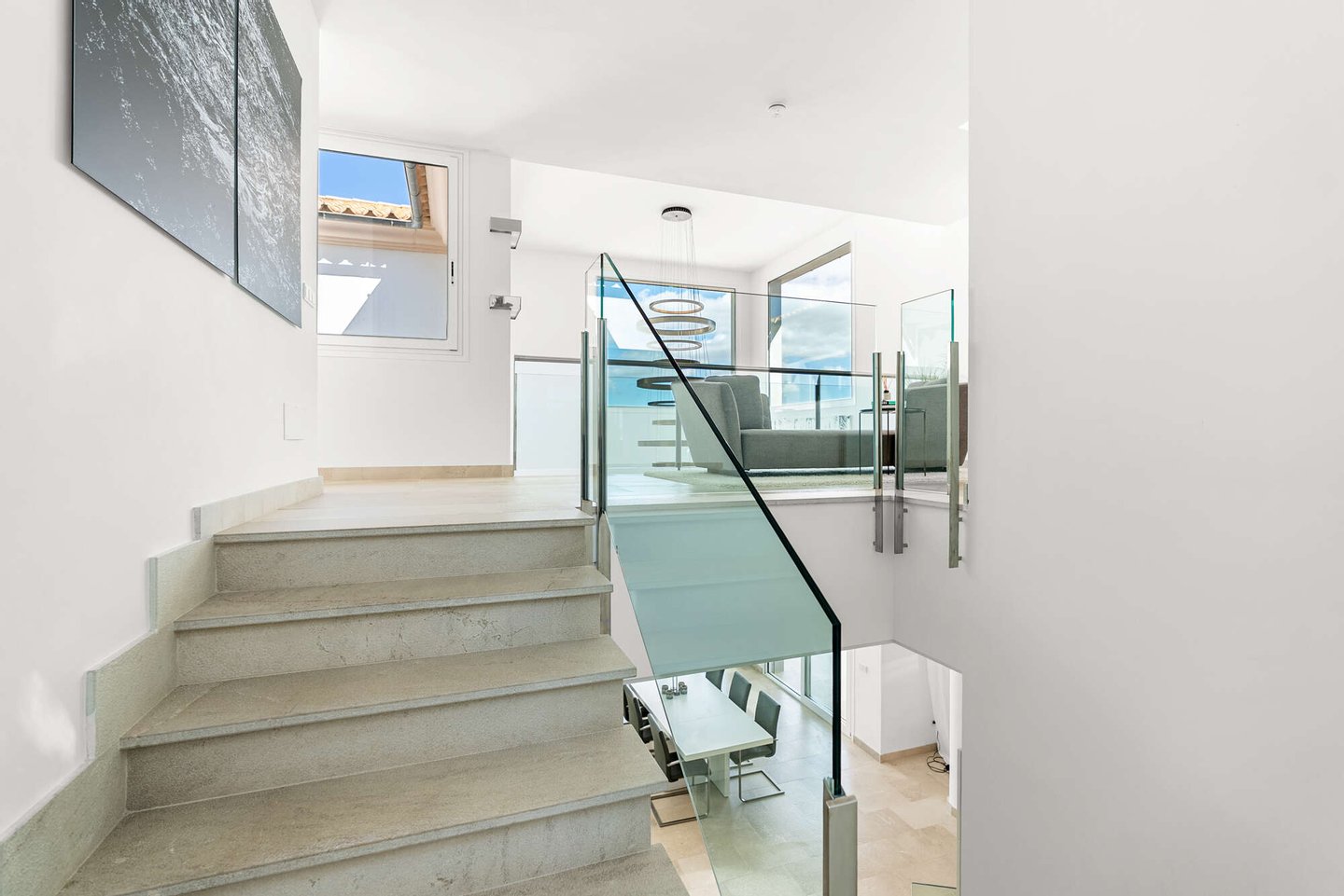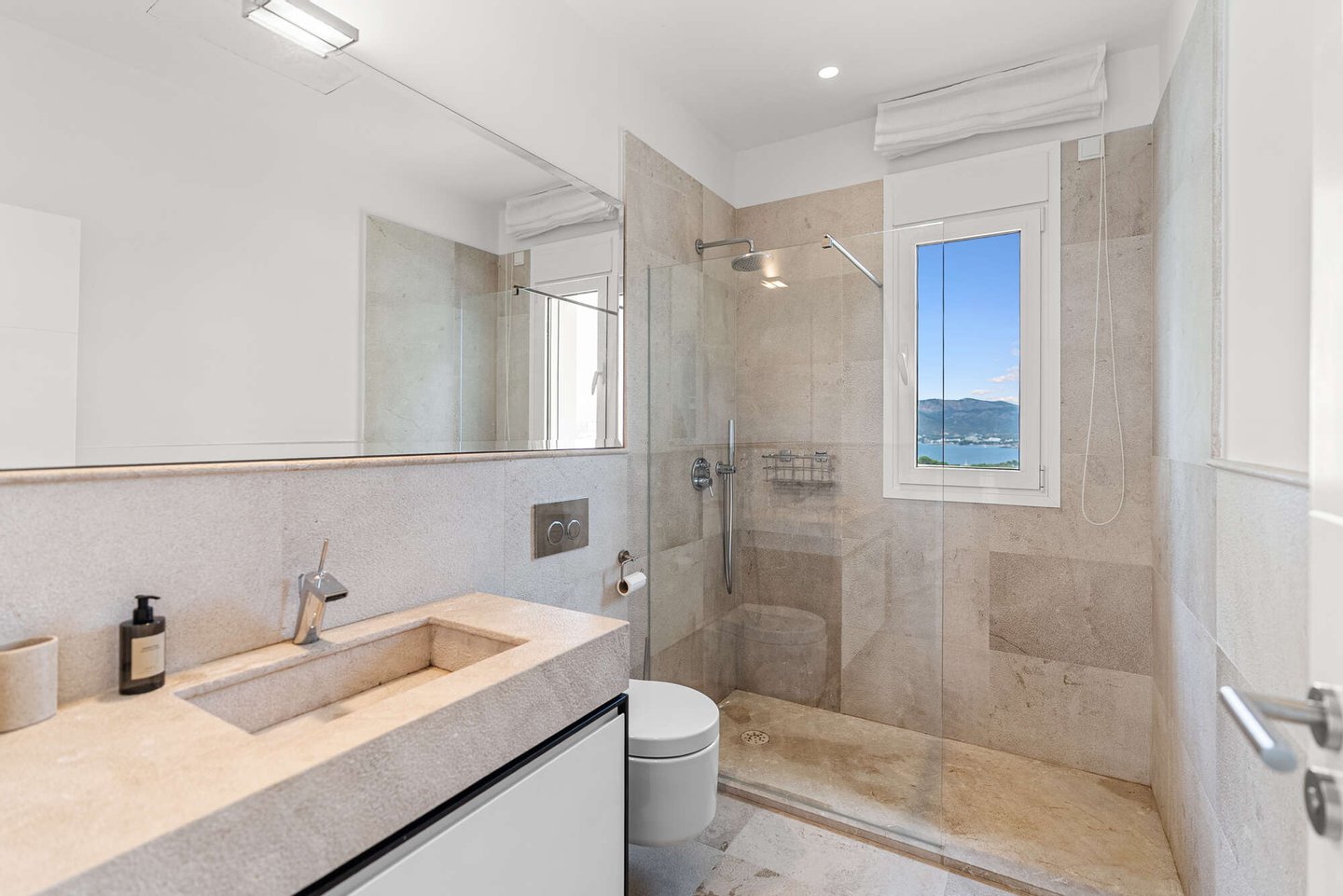 Im Obergeschoss befindet sich die exklusive Mastersuite – ein privater Rückzugsort mit atemberaubendem Meerblick, edlem Bad en suite und Zugang zu einer Panorama-Terrasse. Zwei weitere Schlafzimmer, ebenfalls mit luxuriösen Bädern en suite, bieten höchsten Komfort für Familie oder anspruchsvolle Gäste.