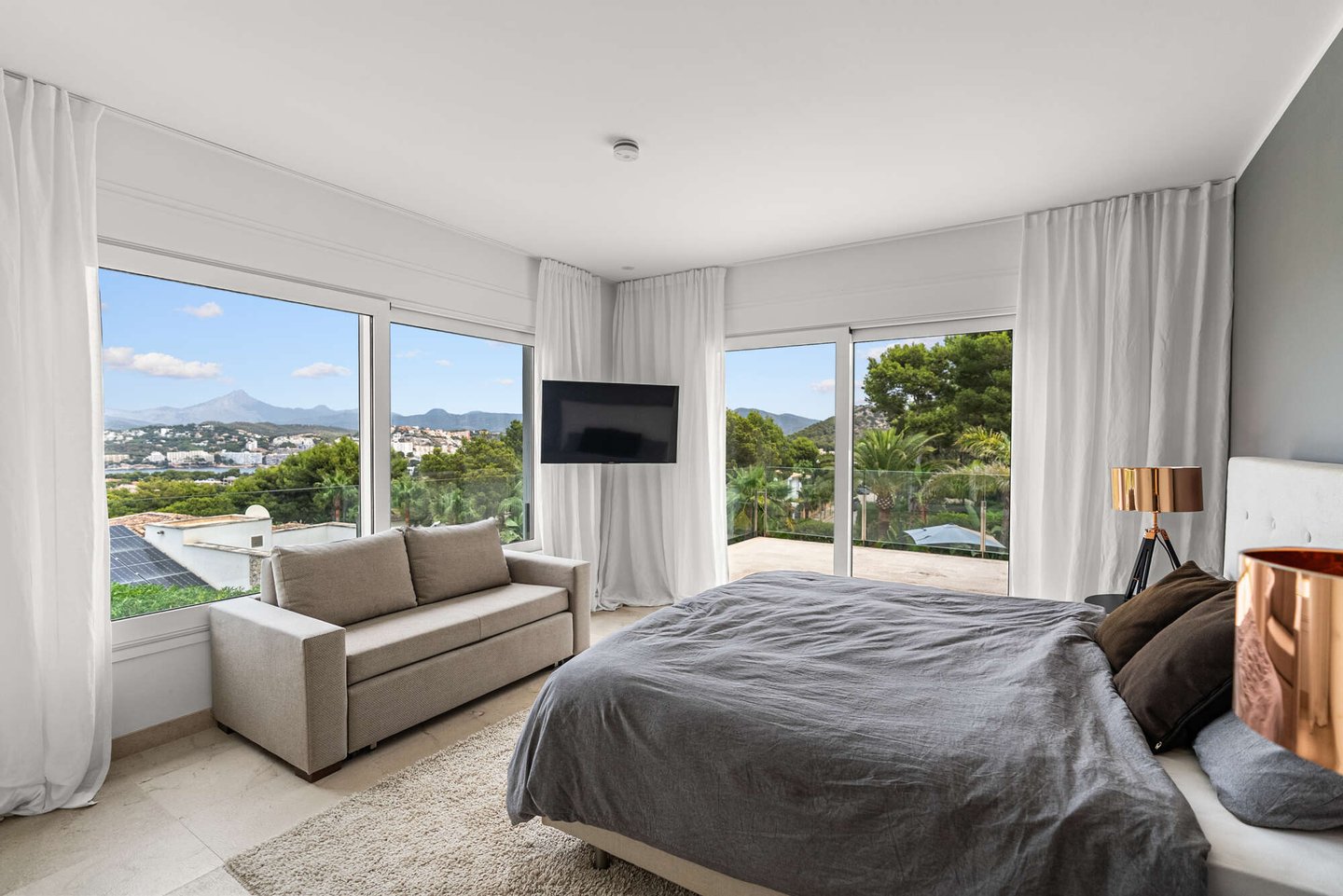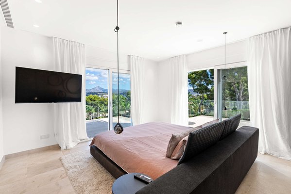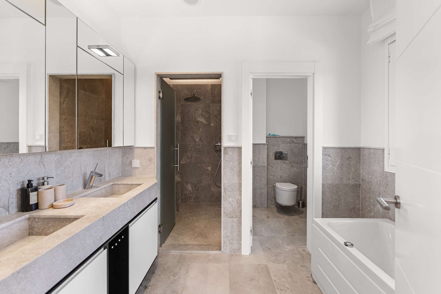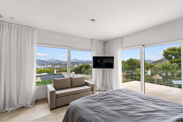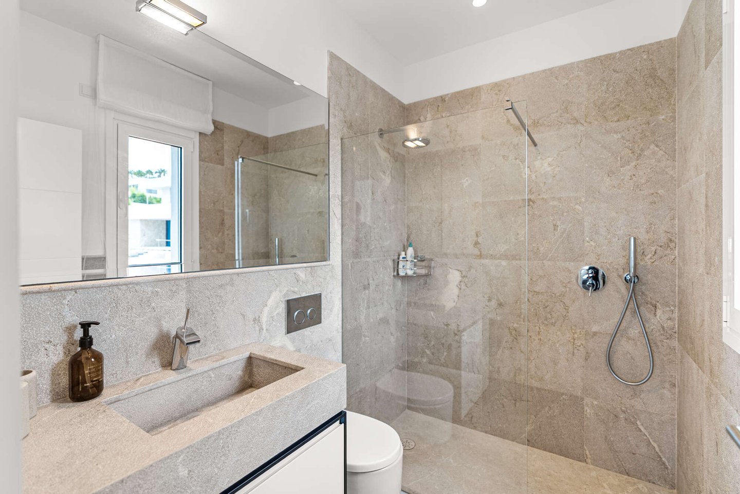 Im Obergeschoss befindet sich die exklusive Mastersuite – ein privater Rückzugsort mit atemberaubendem Meerblick, edlem Bad en suite und Zugang zu einer Panorama-Terrasse. Zwei weitere Schlafzimmer, ebenfalls mit luxuriösen Bädern en suite, bieten höchsten Komfort für Familie oder anspruchsvolle Gäste.