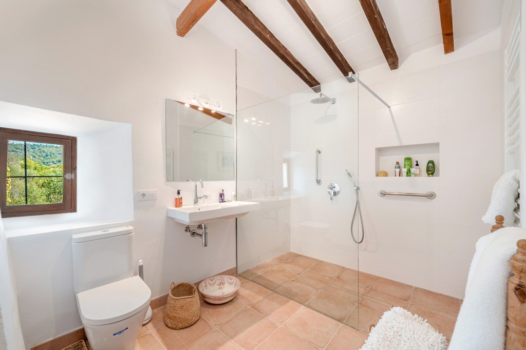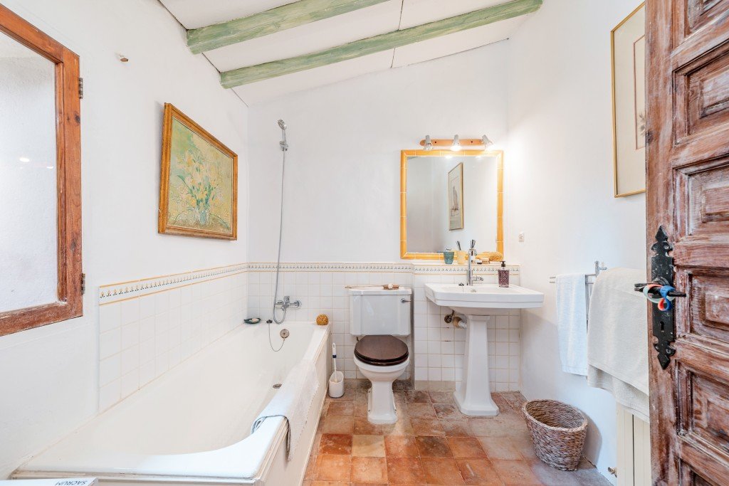 Das Haus ist ebenerdig angelegt und verfügt über vier Schlafzimmer und drei Badezimmer, darunter ein Ankleidezimmer. Die Innenräume zeigen klassische Merkmale wie Terrakottaböden und freiliegende Holzbalken, ergänzt durch zwei Kamine und eine Zentralheizung mit Öl. Die separate Küche ist komplett ausgestattet und wird durch eine Waschküche, Abstellräume und überdachte Terrassen ergänzt.