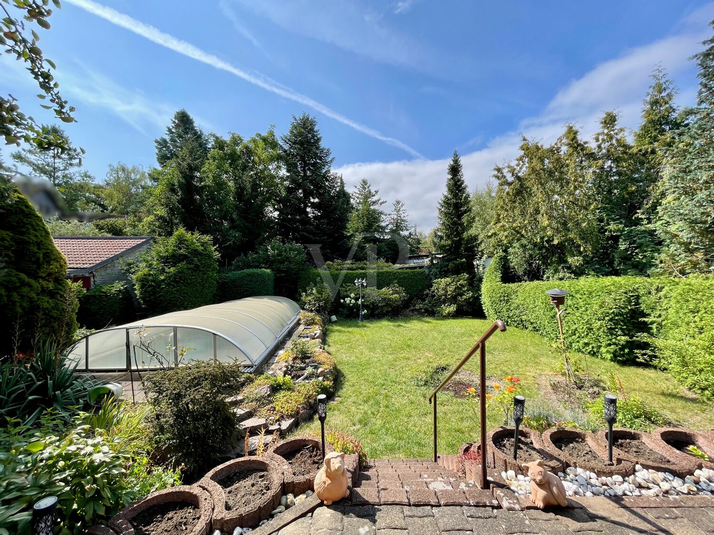 Der sonnige Garten ist nach Süden ausgerichtet und lädt mit seinem Platzangebot zu vielfältigen Gestaltungsmöglichkeiten ein. Ein Pool ist bereits vorhanden – er wartet nur darauf, wiedererweckt zu werden, um in Zukunft für Badespaß zu sorgen. Zusätzlich bietet das Grundstück eine geräumige Garage, um Ihr Fahrzeug geschützt unterzubringen. Eine ehemalige Tiefgarage ist zwar nicht mehr mit einem Fahrzeug zugänglich, eignet sich aber hervorragend als großzügiger Abstellraum.