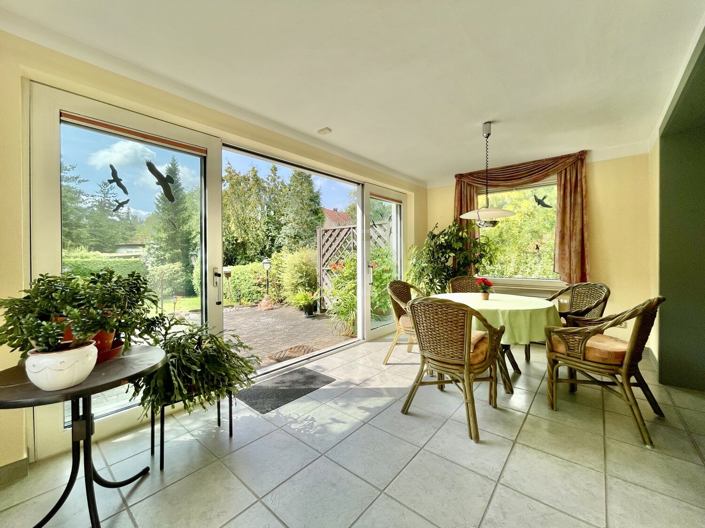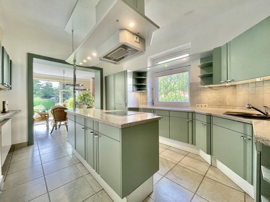 Die Wohnung im Erdgeschoss empfängt Sie mit einem weitläufigen Flur. Von hier aus gelangen Sie in das helle Esszimmer, das durch Schiebetüren mit dem angrenzenden Wohnzimmer verbunden ist – ein Ort, der zu geselligen Abenden einlädt. Die geräumige Küche ist bereits mit einer Einbauküche samt Mittelinsel und Induktionskochfeld ausgestattet und bietet direkten Zugang zur gemütlichen Veranda. Von hier genießen Sie einen herrlichen Blick in den liebevoll angelegten Garten sowie auf die vorgelagerte, ca. 24 m² große Terrasse mit elektrischer Markise – perfekt für entspannte Stunden im Freien. Ein weiteres großzügiges Zimmer sowie ein tagesbelichtetes, gefliestes Duschbad runden diese Ebene ab.