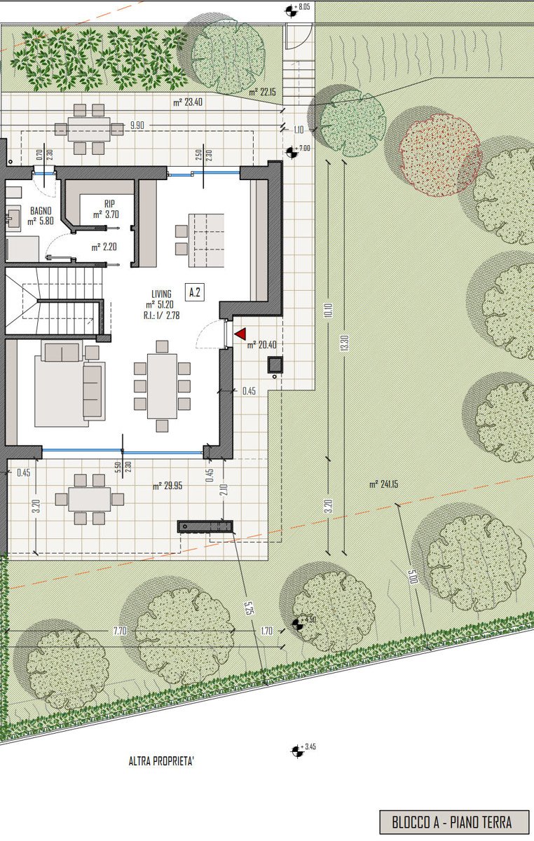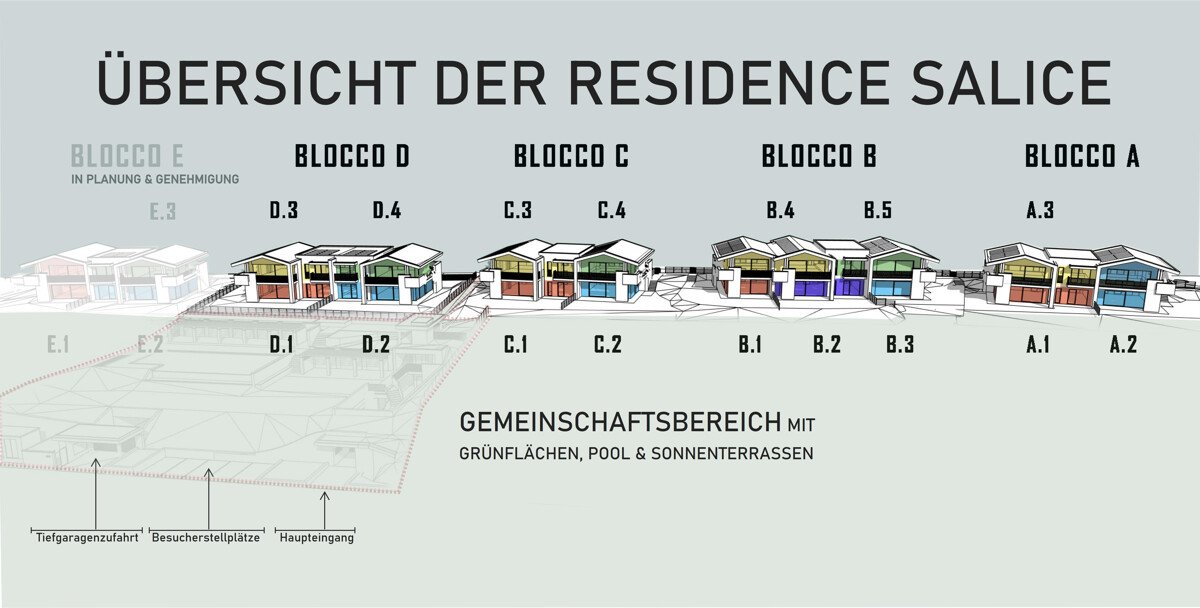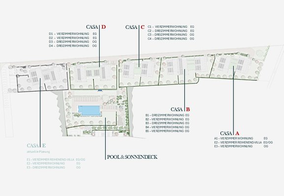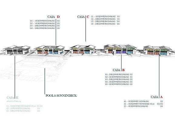 Auf dem herrlichen Grundstück werden vier zweigeschossige Gebäude (Casa A bis D) mit jeweils drei bis maximal fünf komfortablen Wohnungen errichtet. Ein weiteres Gebäude (Casa E), das eine Reihenend-Villa und zwei Wohnungen beinhalten soll, ist aktuell in Planung.